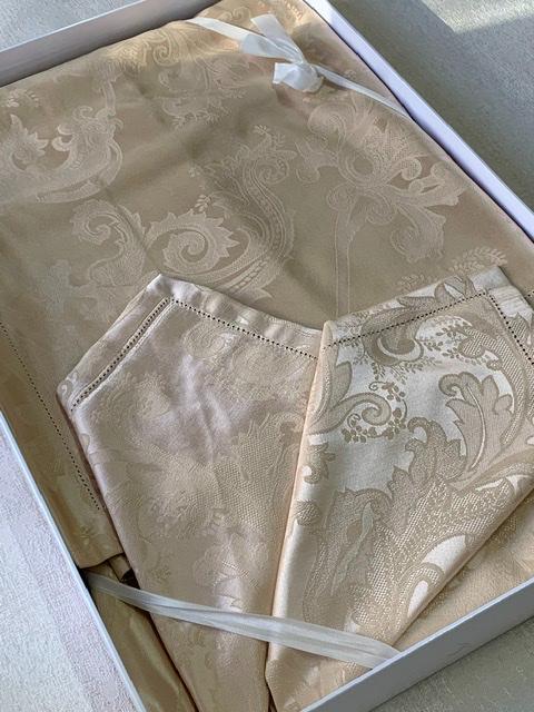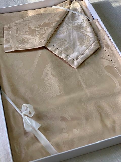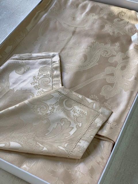 В этот комплект столового белья от известного итальянского производителя столового белья Gamba входит прямоугольная жаккардовая скатерть и 6 салфеток.