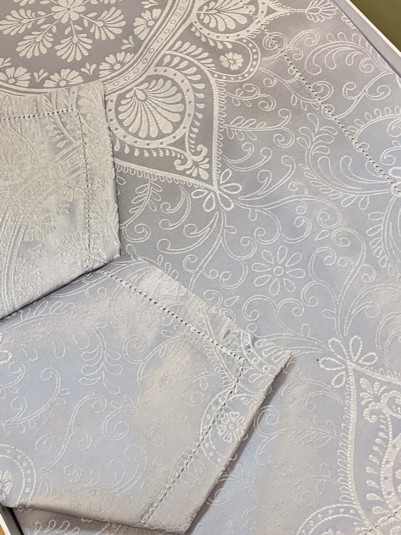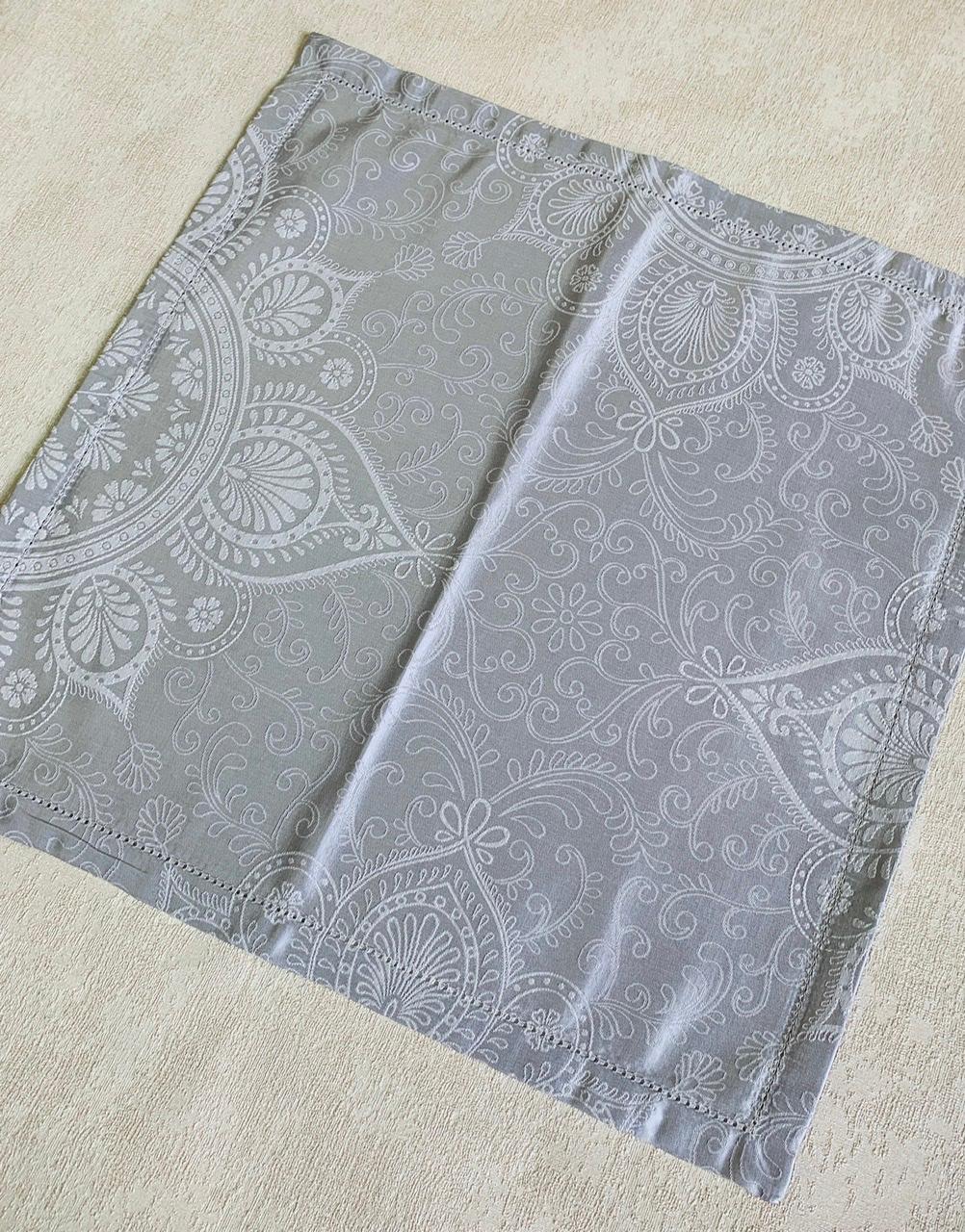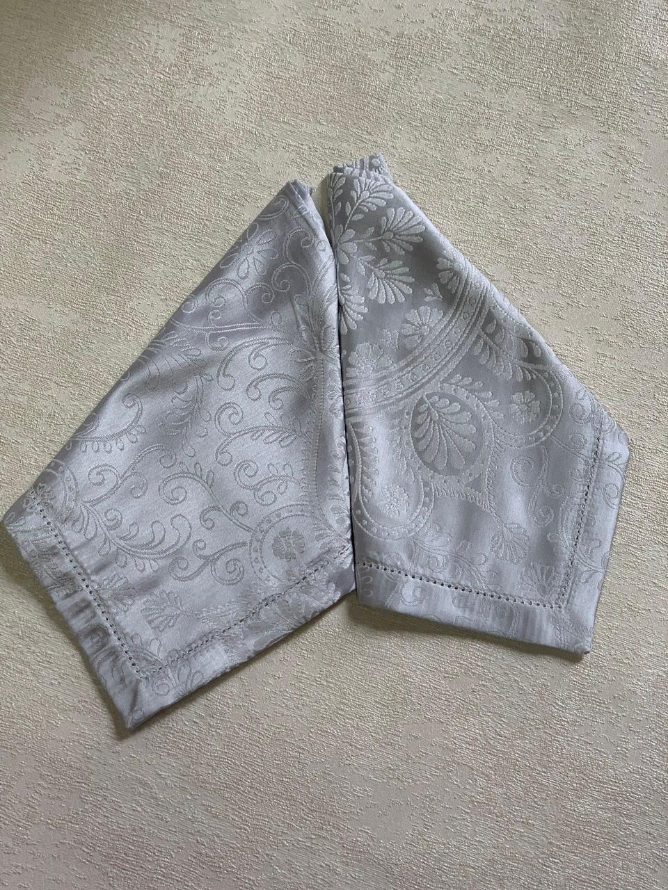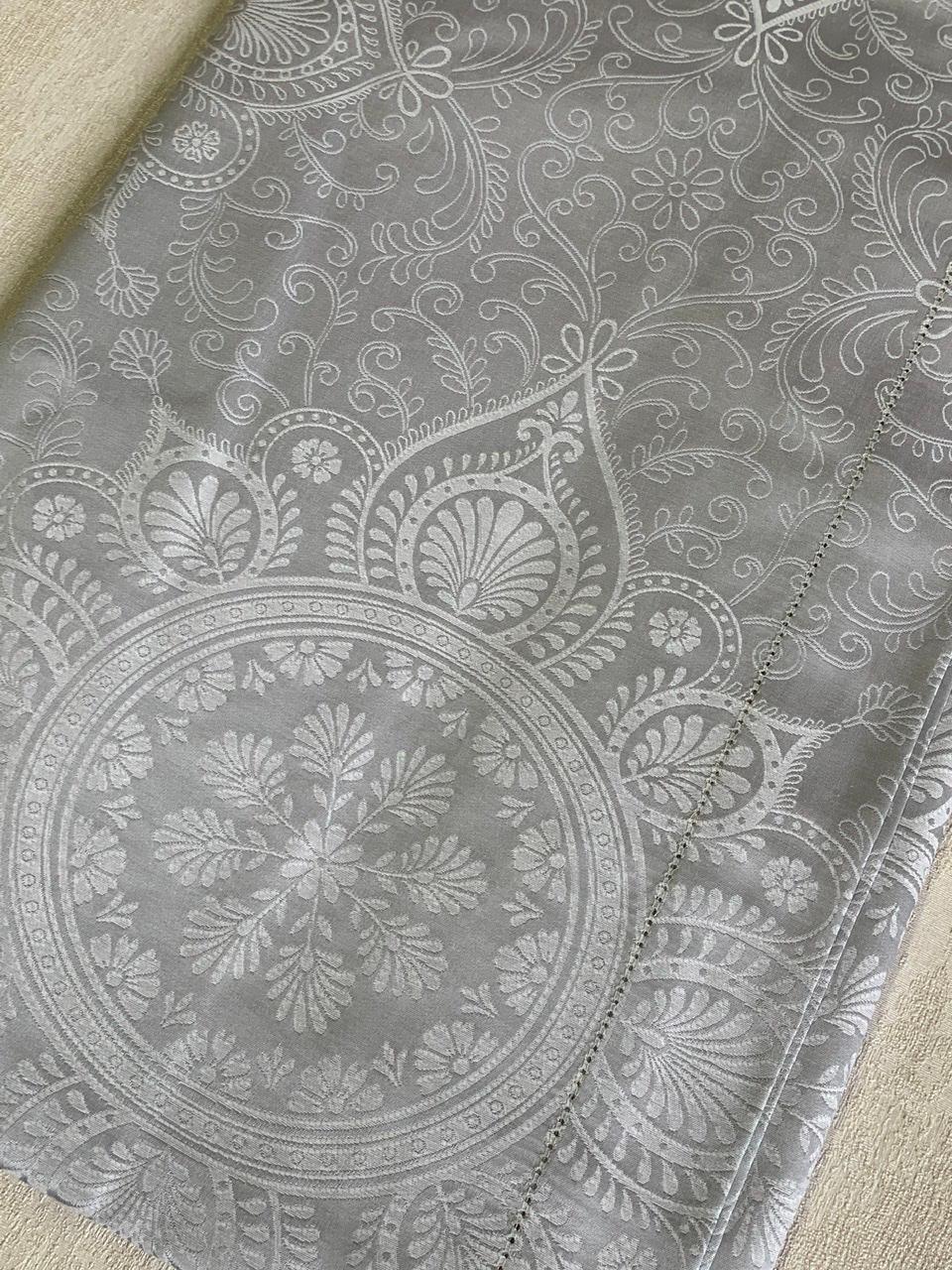 В этот комплект столового белья Gamba входит прямоугольная жаккардовая скатерть редкого жемчужно-серого цвета, скатерть с роскошным узором и салфетки.
