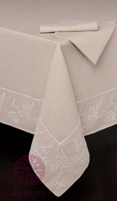 Скатерть «Сантолина» на 50% состоит из льна — популярной во все времена натуральной ткани. Ценным свойством льняной скатерти являются высокая прочность, легкость и стойкость к гниению, а как следствие — экологичность. Скатерти изо льна легко поддаются стирке, а при намокании почти не дают усадки. Ко всему прочему скатерть «Сантолина» красива и приятна на ощупь. Изысканную неповторимость ей придает нежная вышивка по краям. Выбирайте размер скатерти в зависимости от размеров Вашего кухонного стола: 140x140см, 160x300см, 160x280см, 160x260см, 160x240см, 160x220см, 160x180см. К скатерти мы рекомендуем комплект из 6 салфеток «Сантолина».