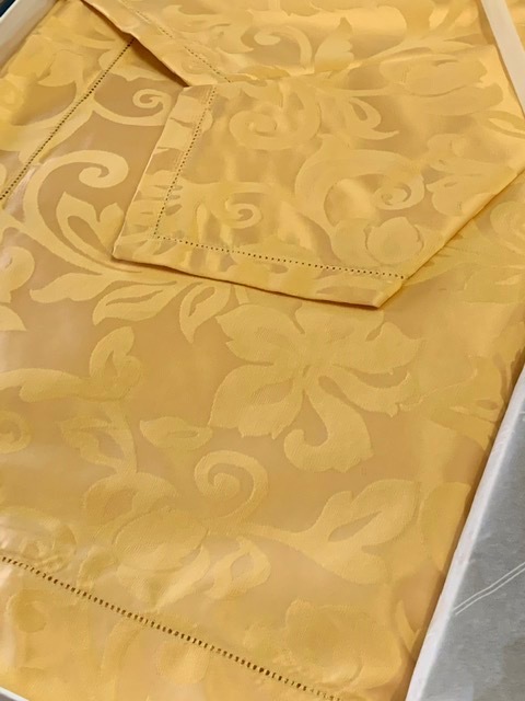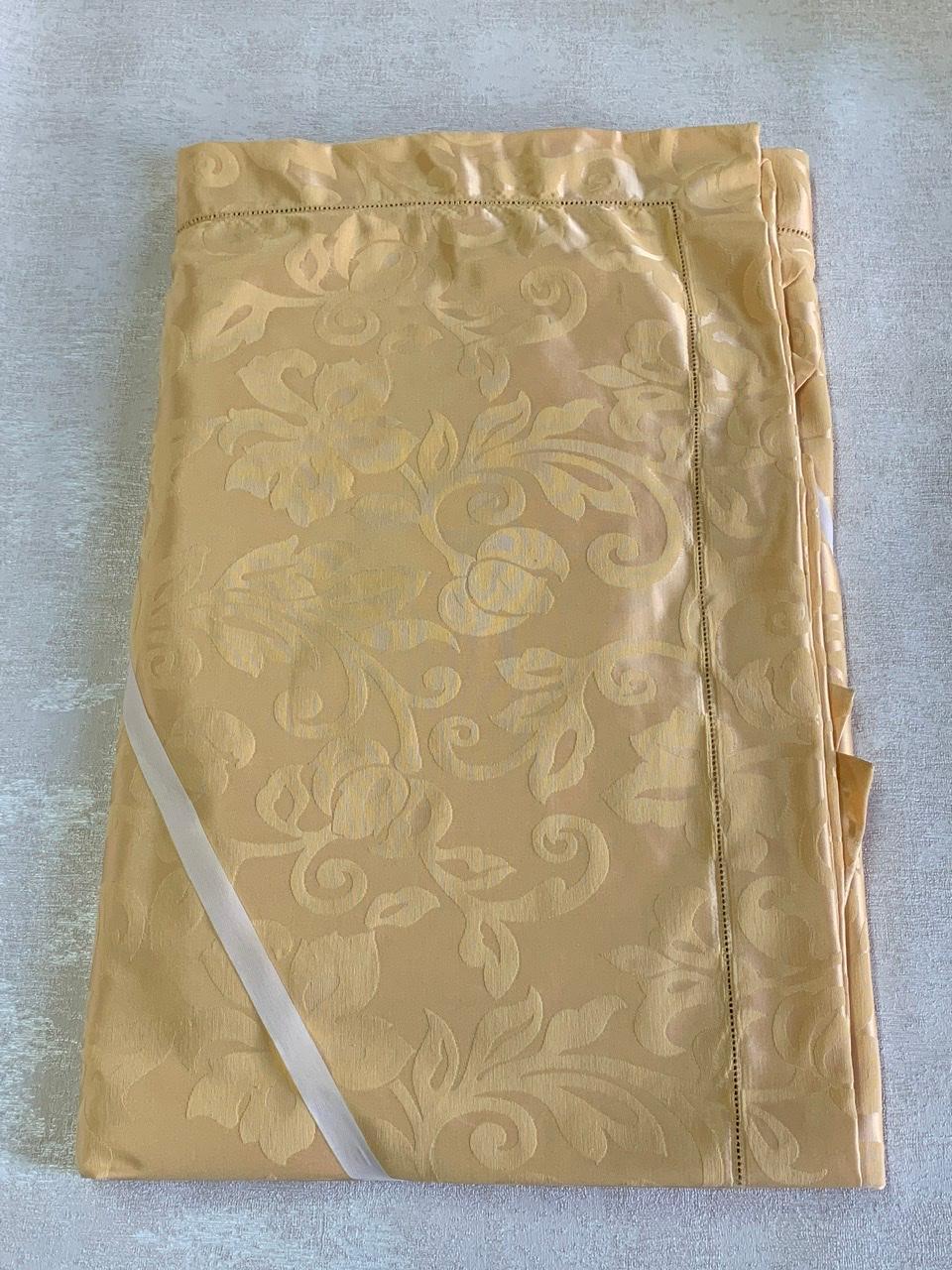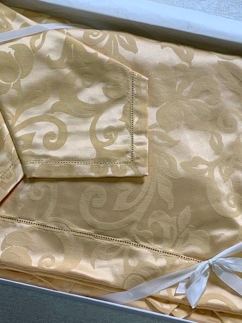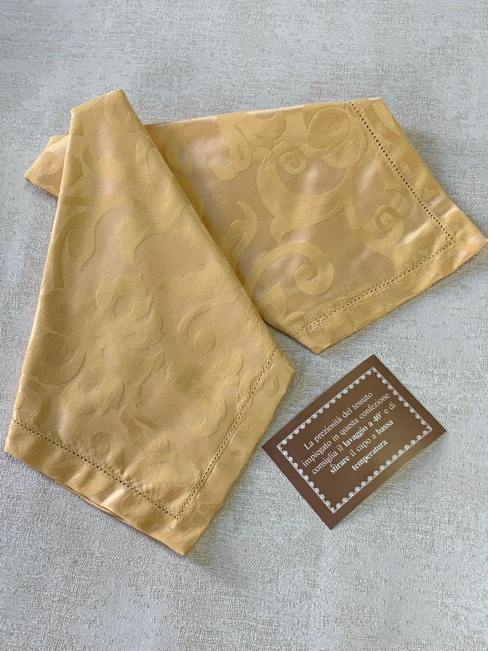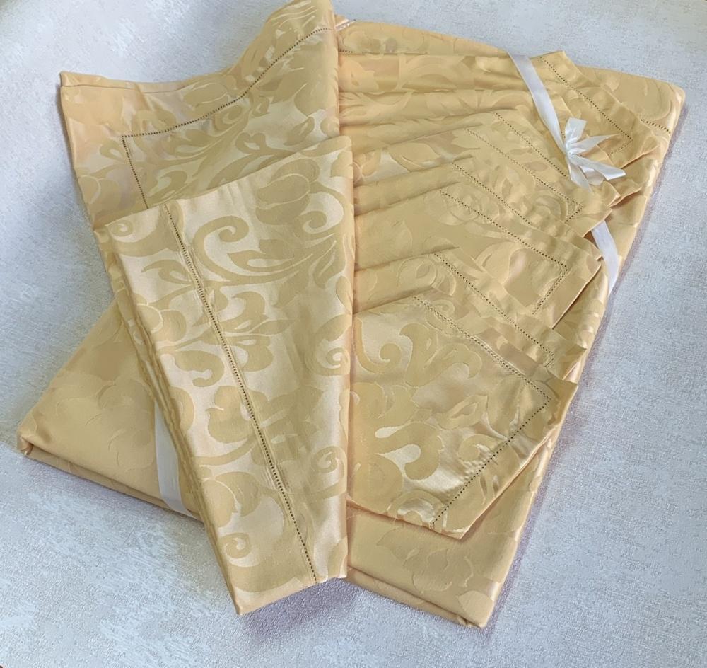 Красивая прямоугольная скатерть с 8 салфетками от итальянского производителя столового белья Gamba представлена в золотом цвете.