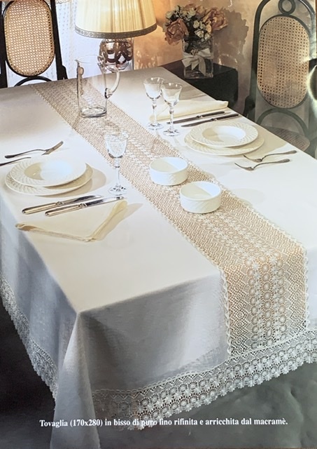 В комплект столового белья Gamba входит прямоугольная скатерть с роскошным кружевом посередине и по всему периметру + 12 салфеток.