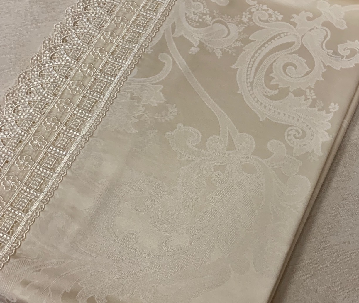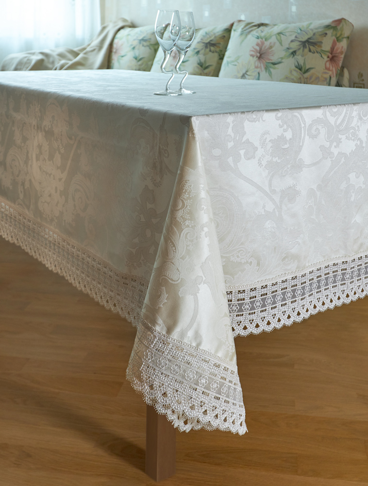 Все скатерти этой фабрики отличаются особенной изысканностью. Изготавливаются из высококачественных тканей, проходят специальную обработку благодаря которой ткань приобретает легкость, после стирки не садится, легко гладится. Кружево пр-ва Швейцарии.