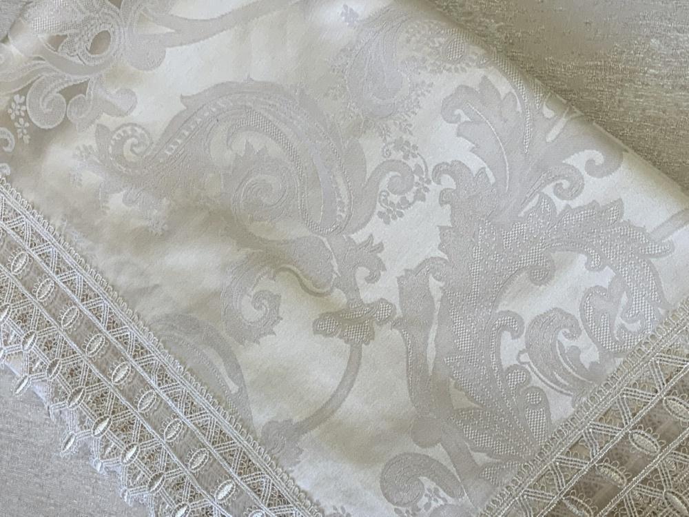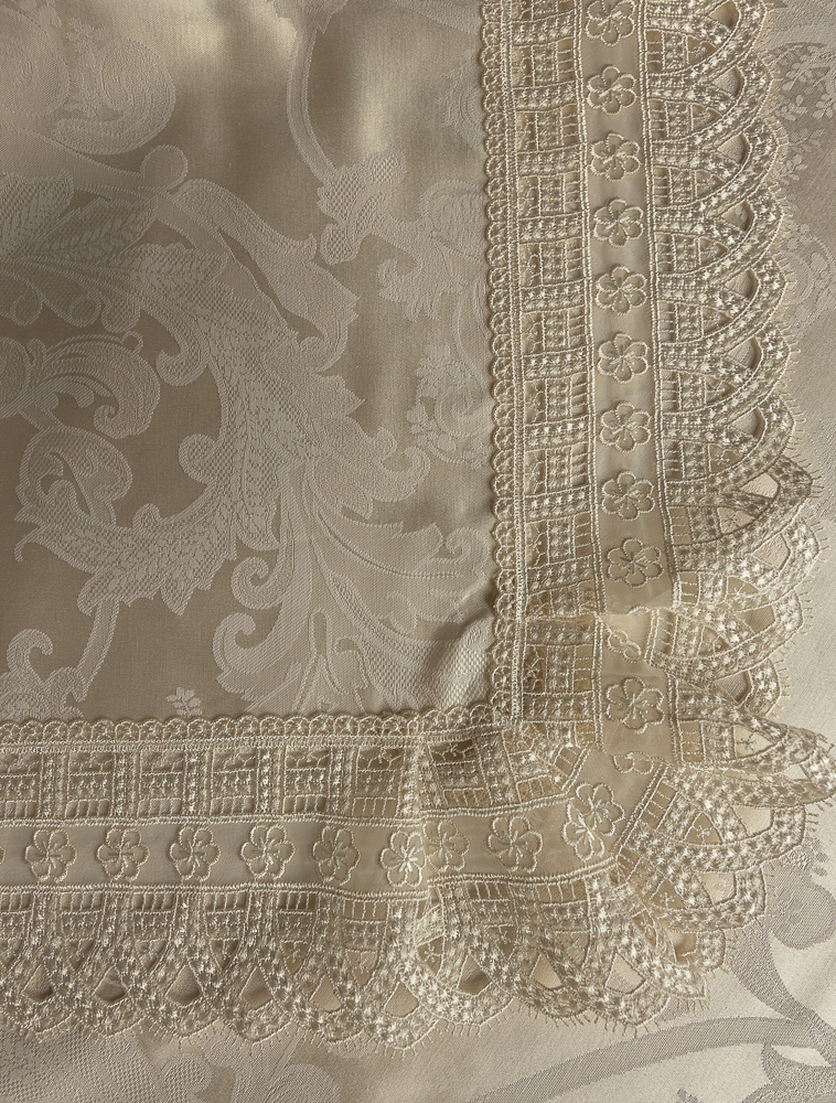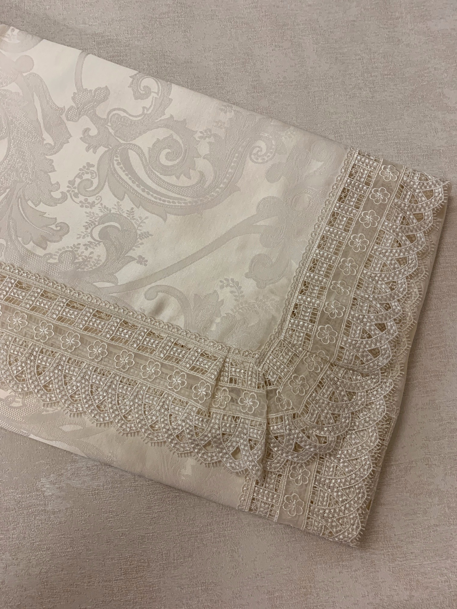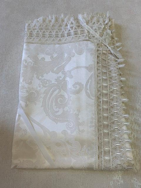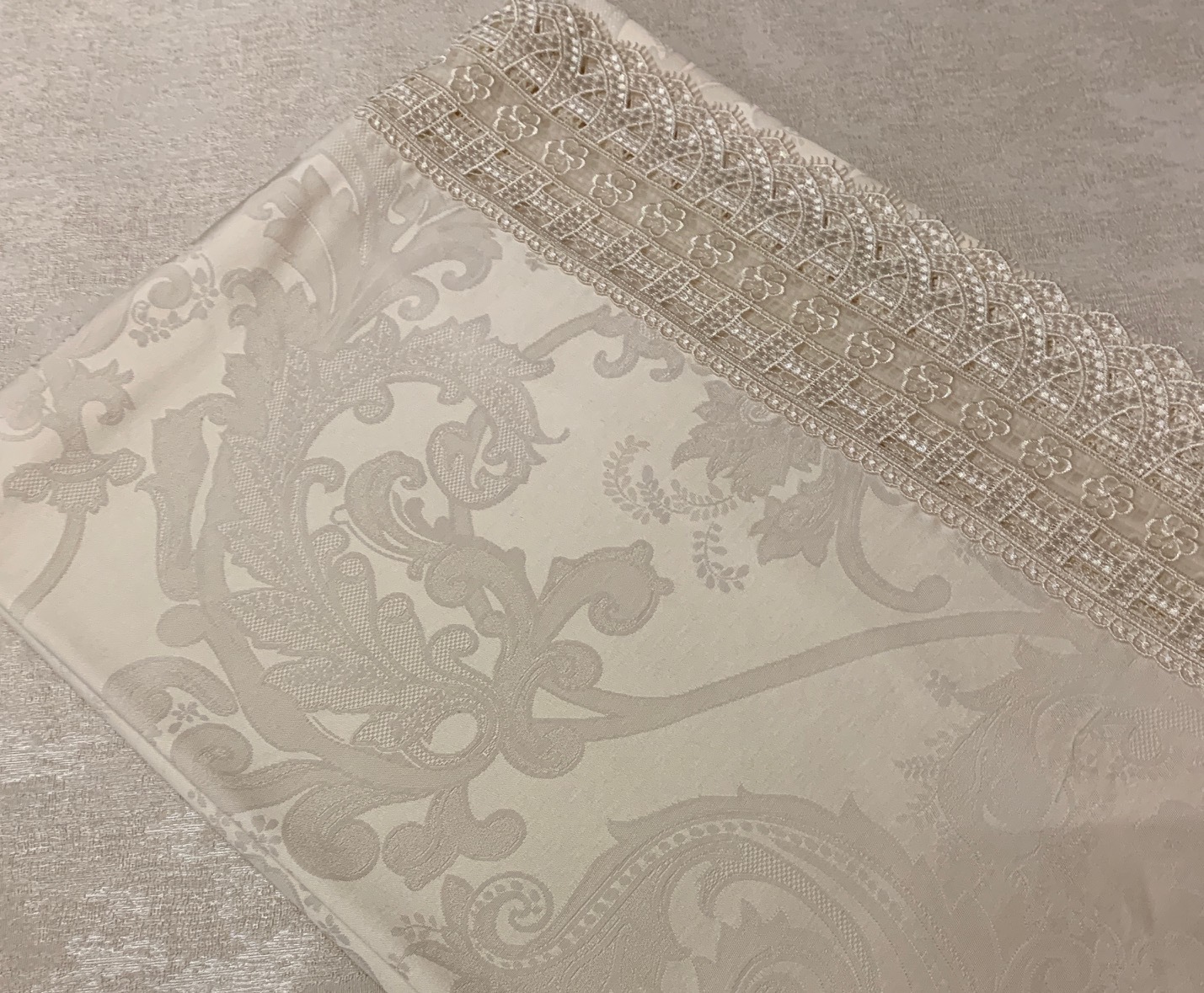 Прямоугольная жаккардовая скатерть с очень красивым кружевом по всему периметру и 12 салфеток.