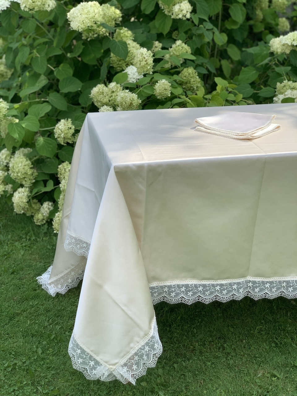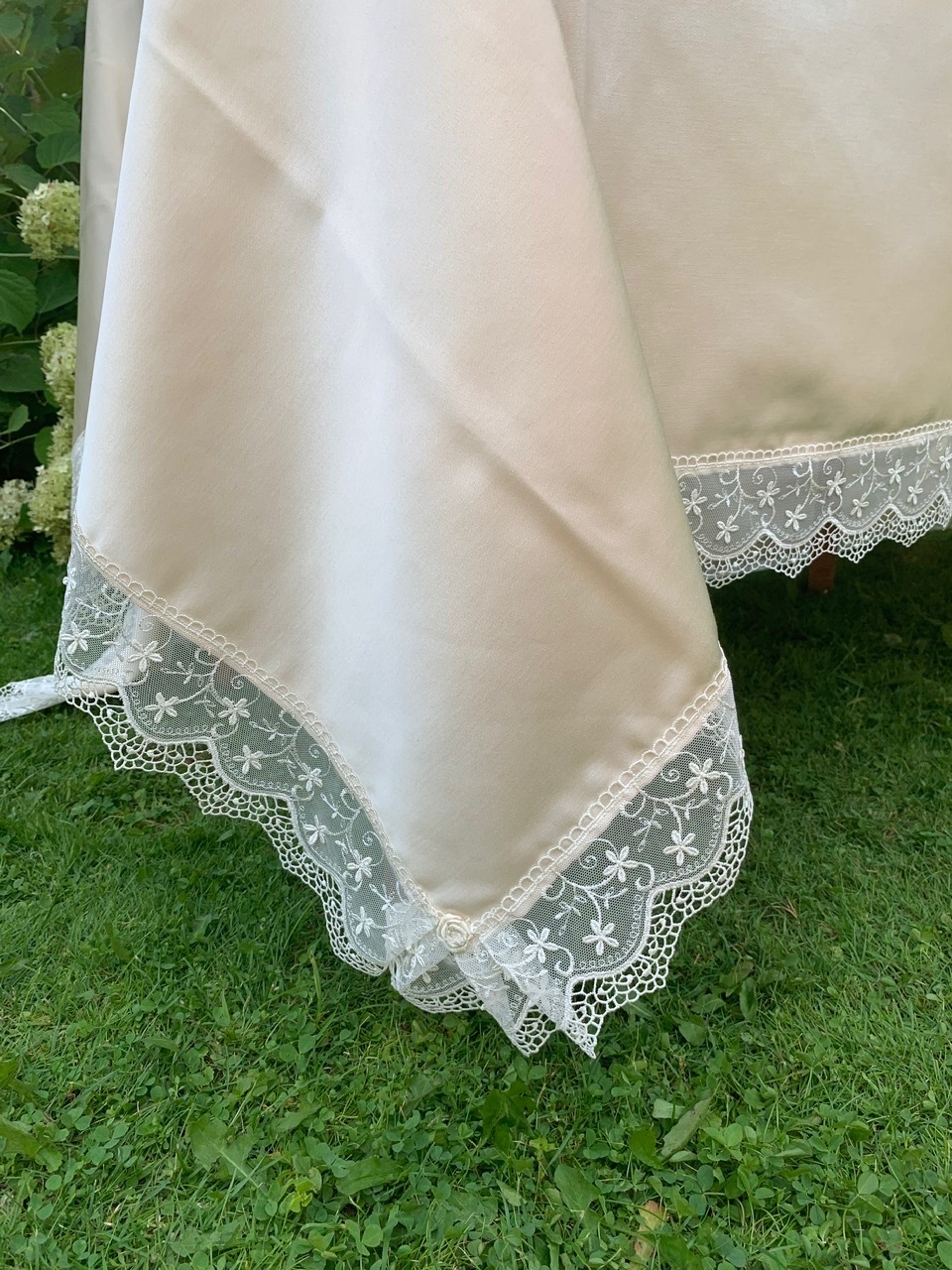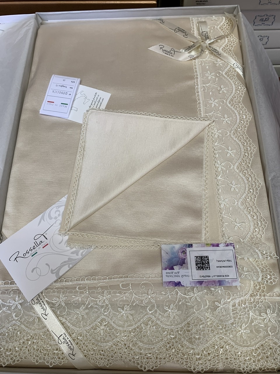 Роскошная атласная итальянская скатерть c салфетками. Украшена красивым кружевом по всему периметру скатерти.