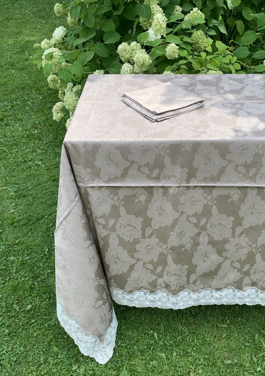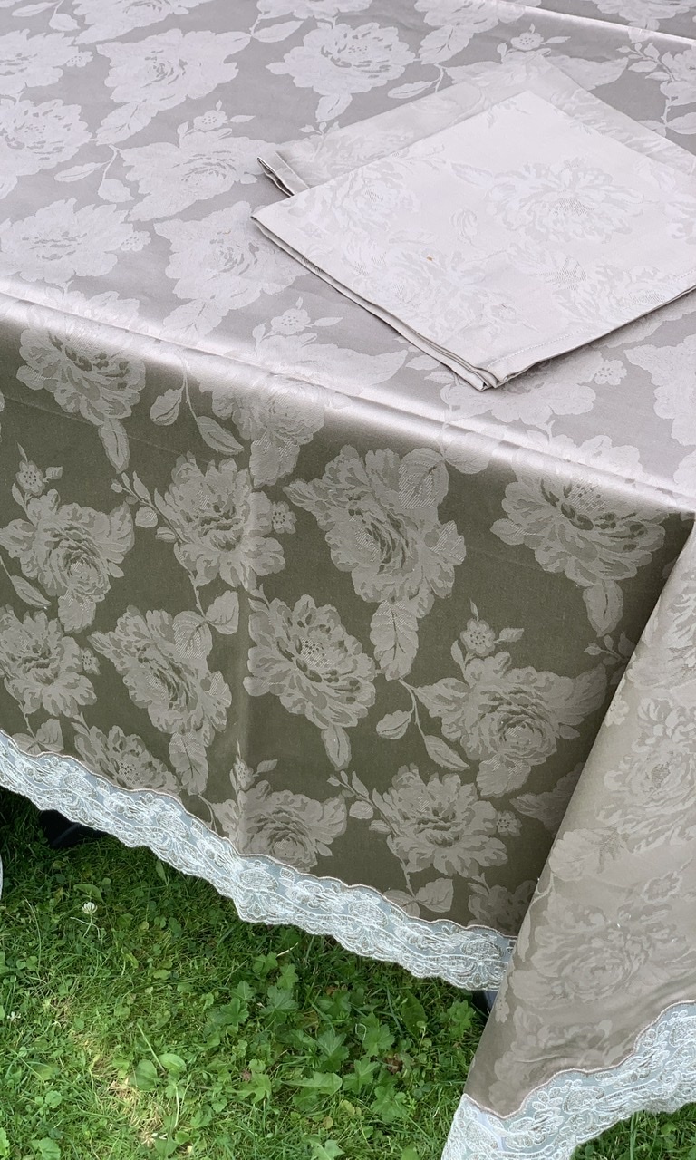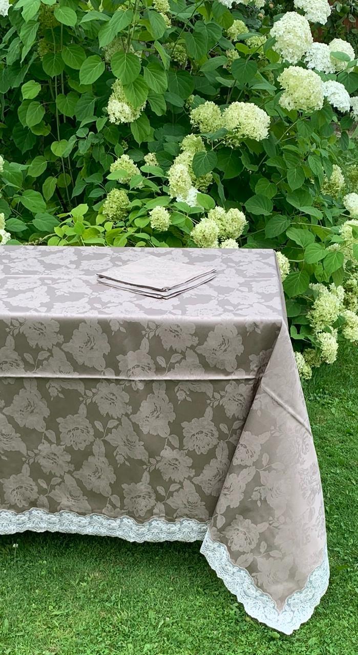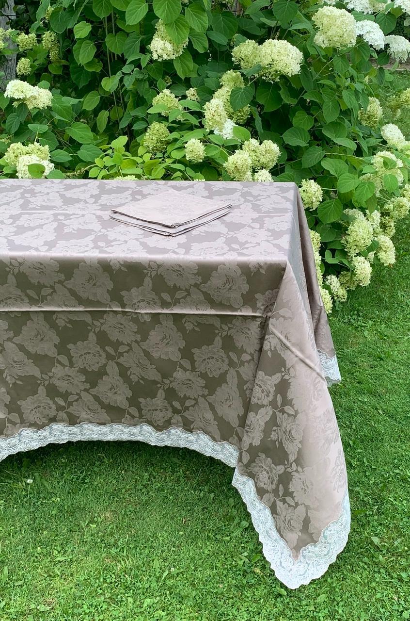 Роскошная жаккардовая скатерть из высококачественного 100% сатина с изящным флорентийским кружевом по краям. Авторская работа.