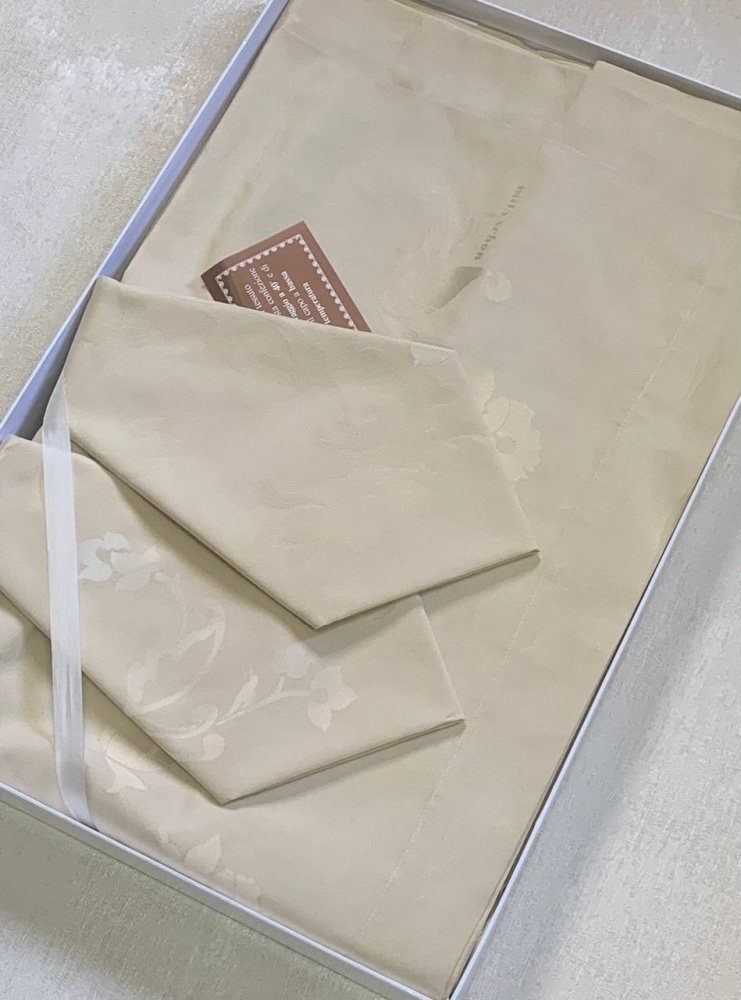 В этот комплект столового белья светло-бежевого цвета от известного итальянского производителя столового белья Gamba входит овальная жаккардовая скатерть с классическим цветочным рисунком и 12 салфеток.