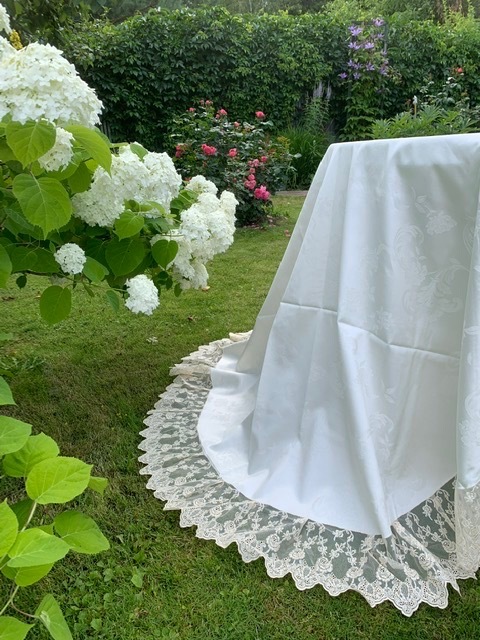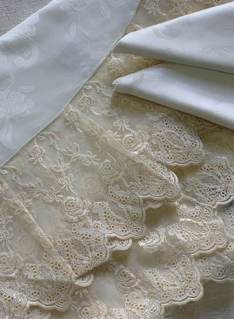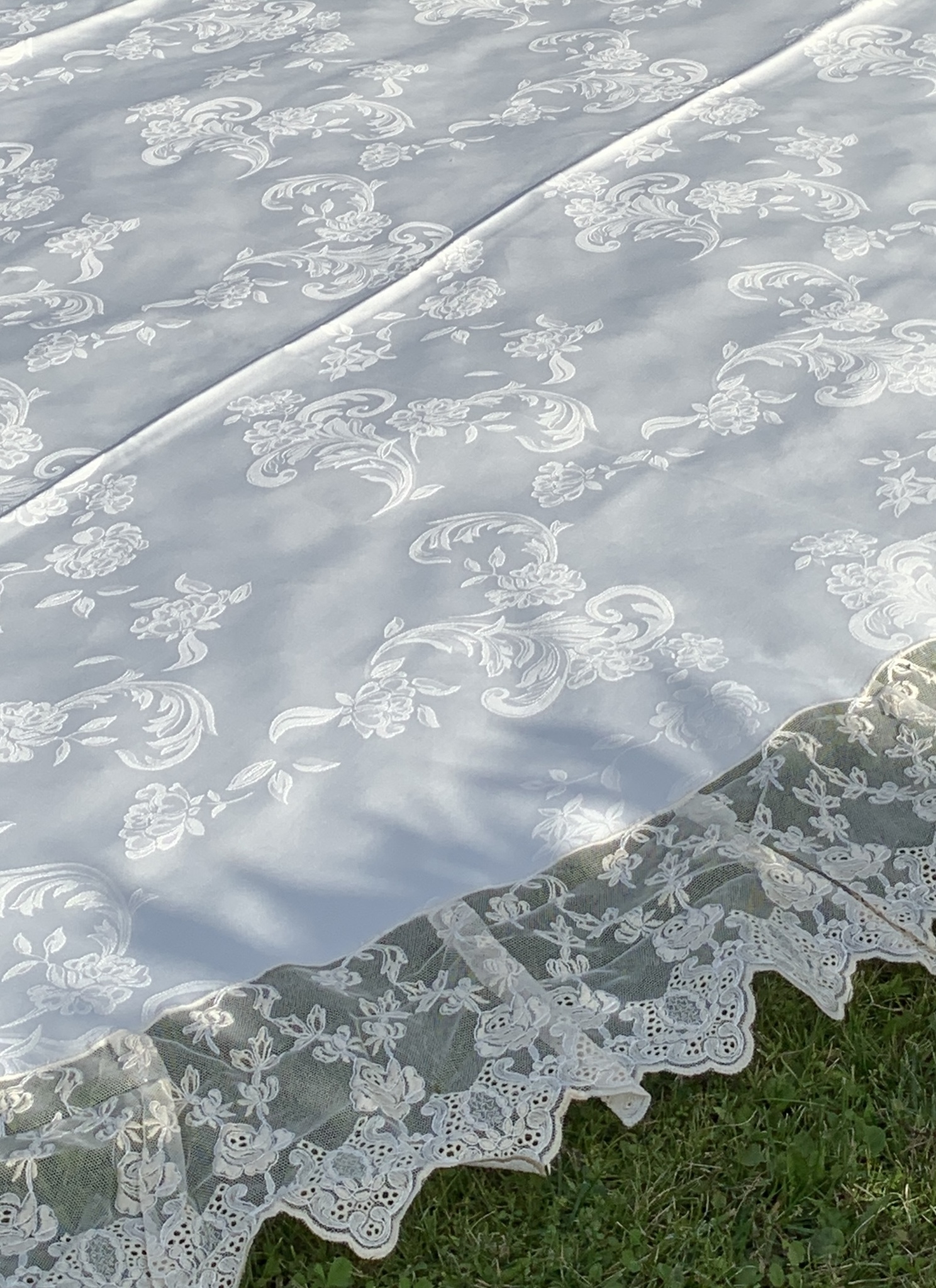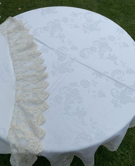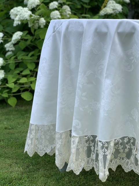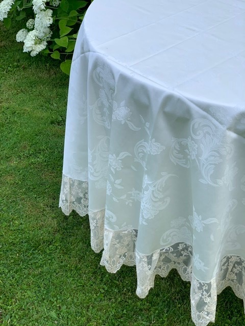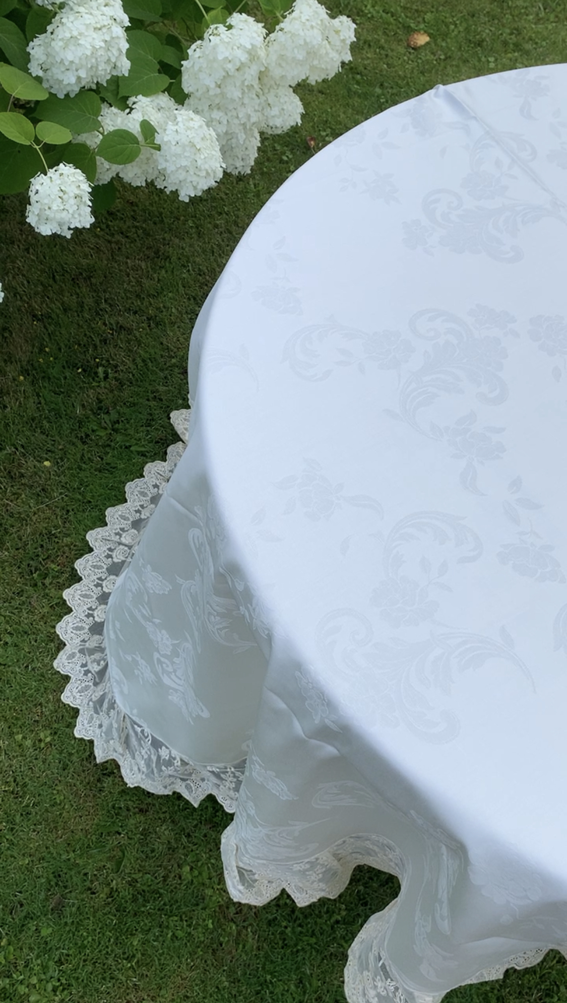 Круглая скатерть премиум-класса из сатин-жаккарда c изысканным флорентийским кружевом по краю.