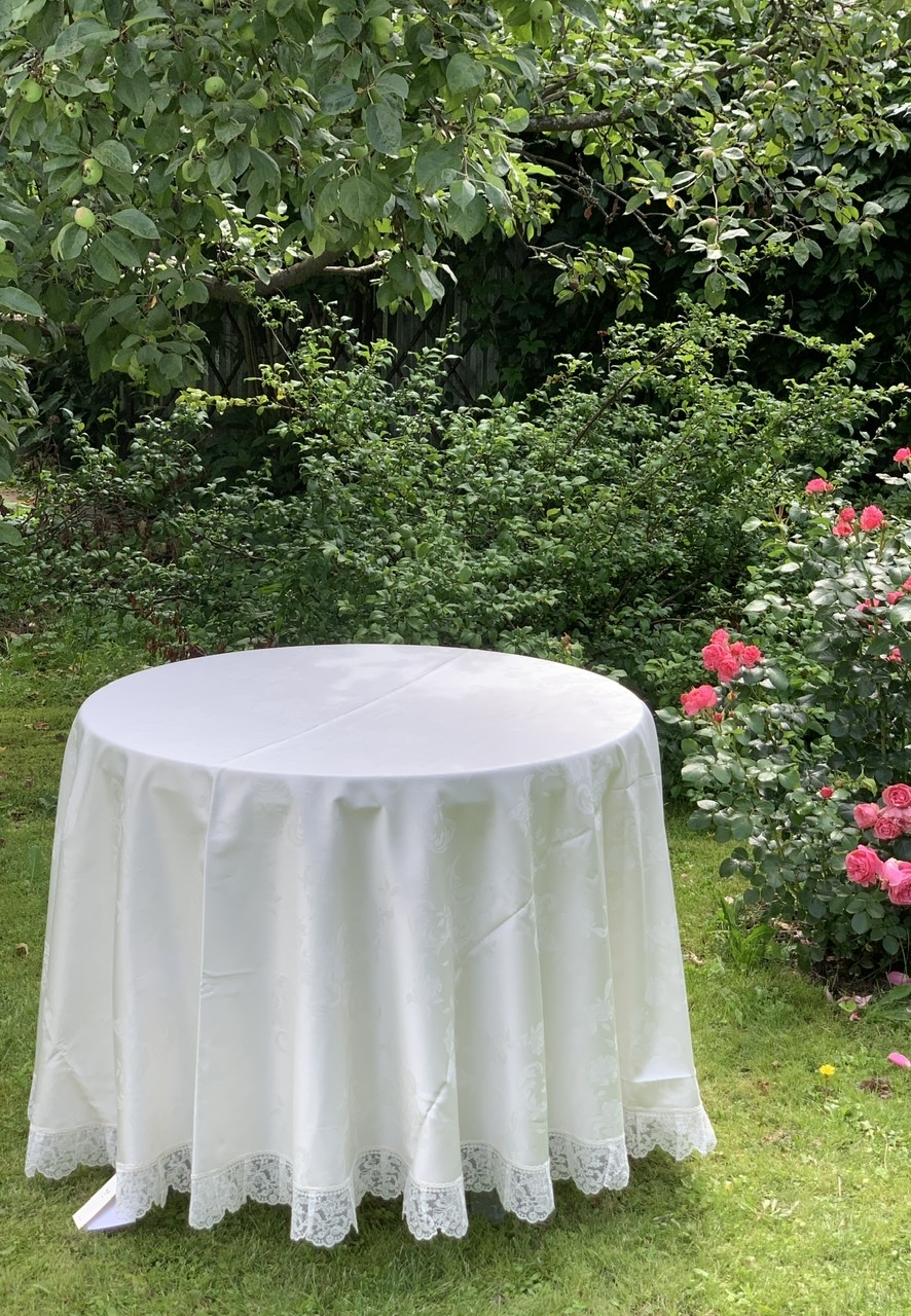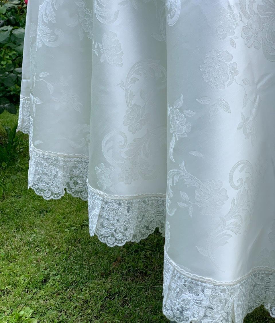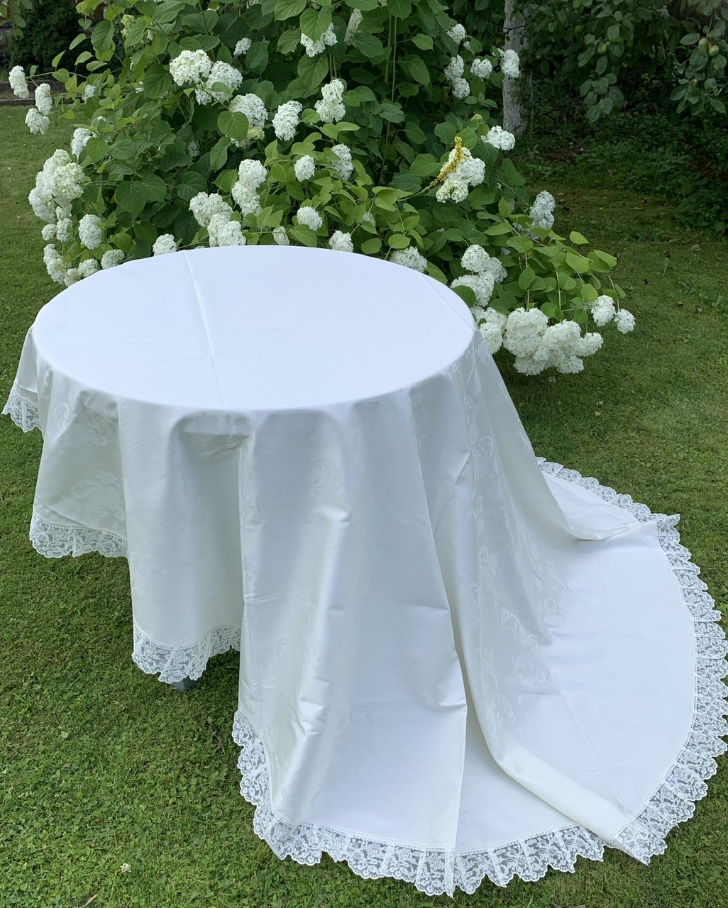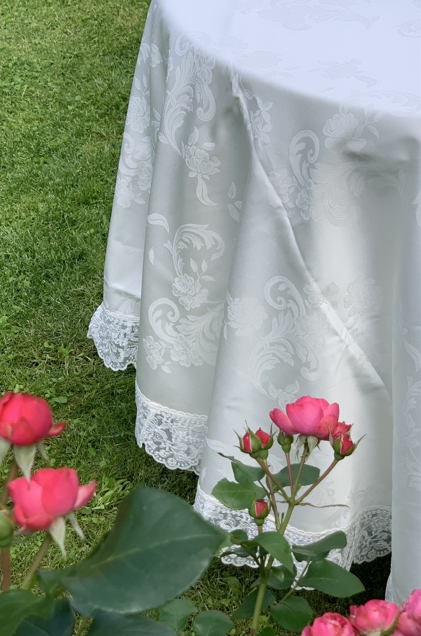 Круглая скатерть премиум-класса из сатин-жаккарда c изысканным флорентийским кружевом по краю.