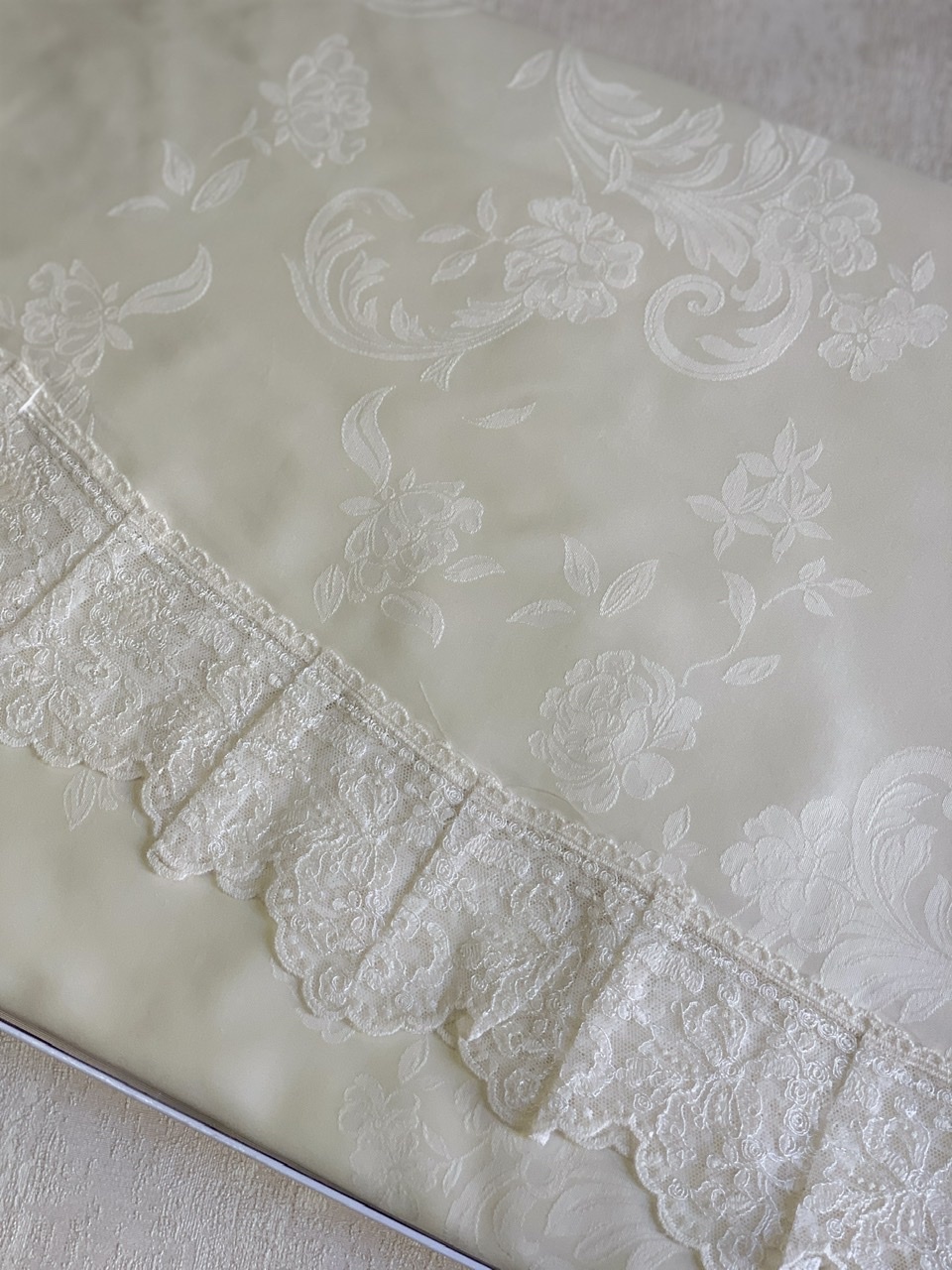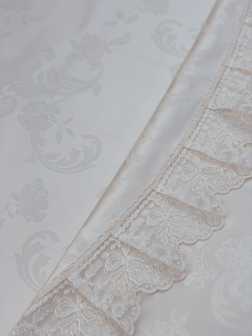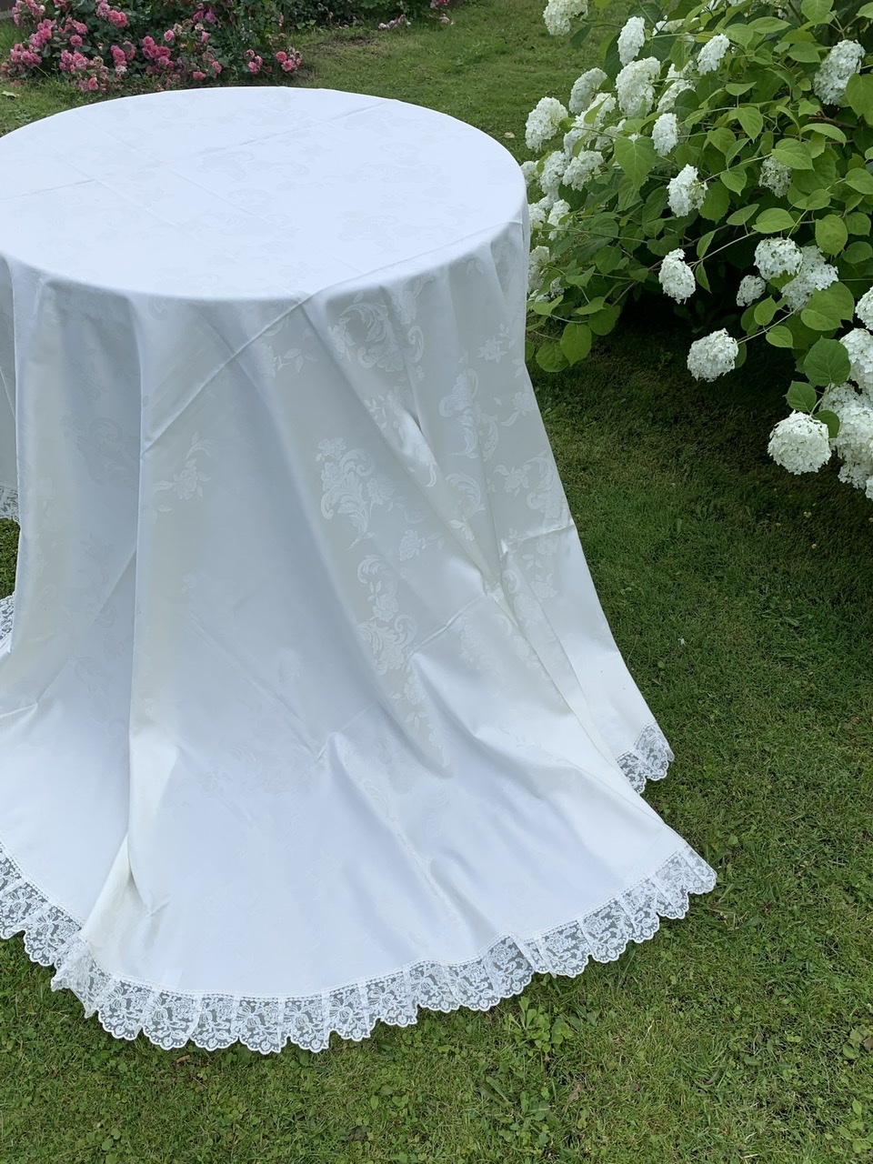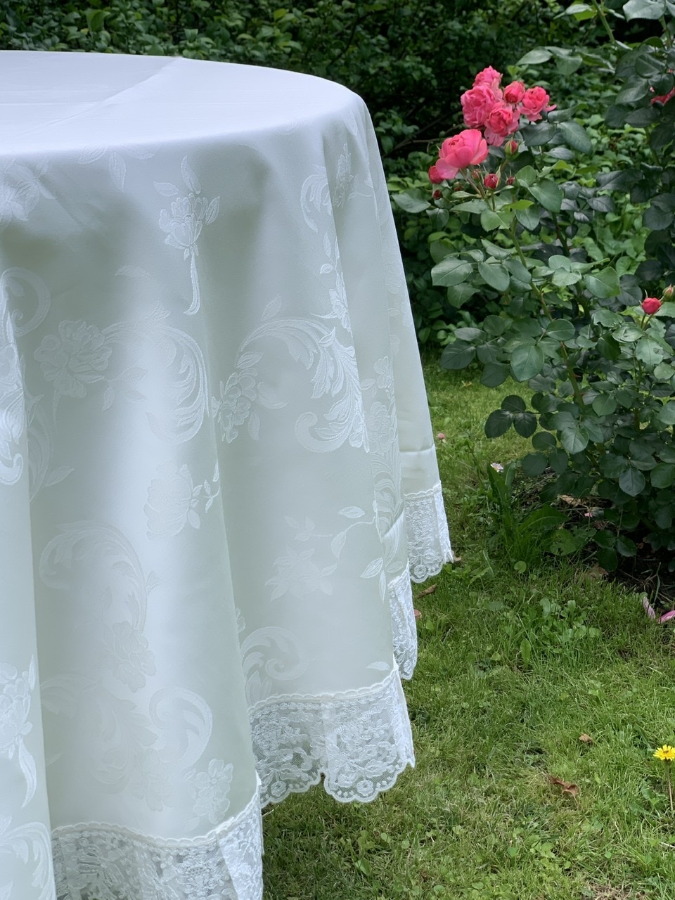 Круглая скатерть премиум-класса из сатин-жаккарда c изысканным флорентийским кружевом по краю.