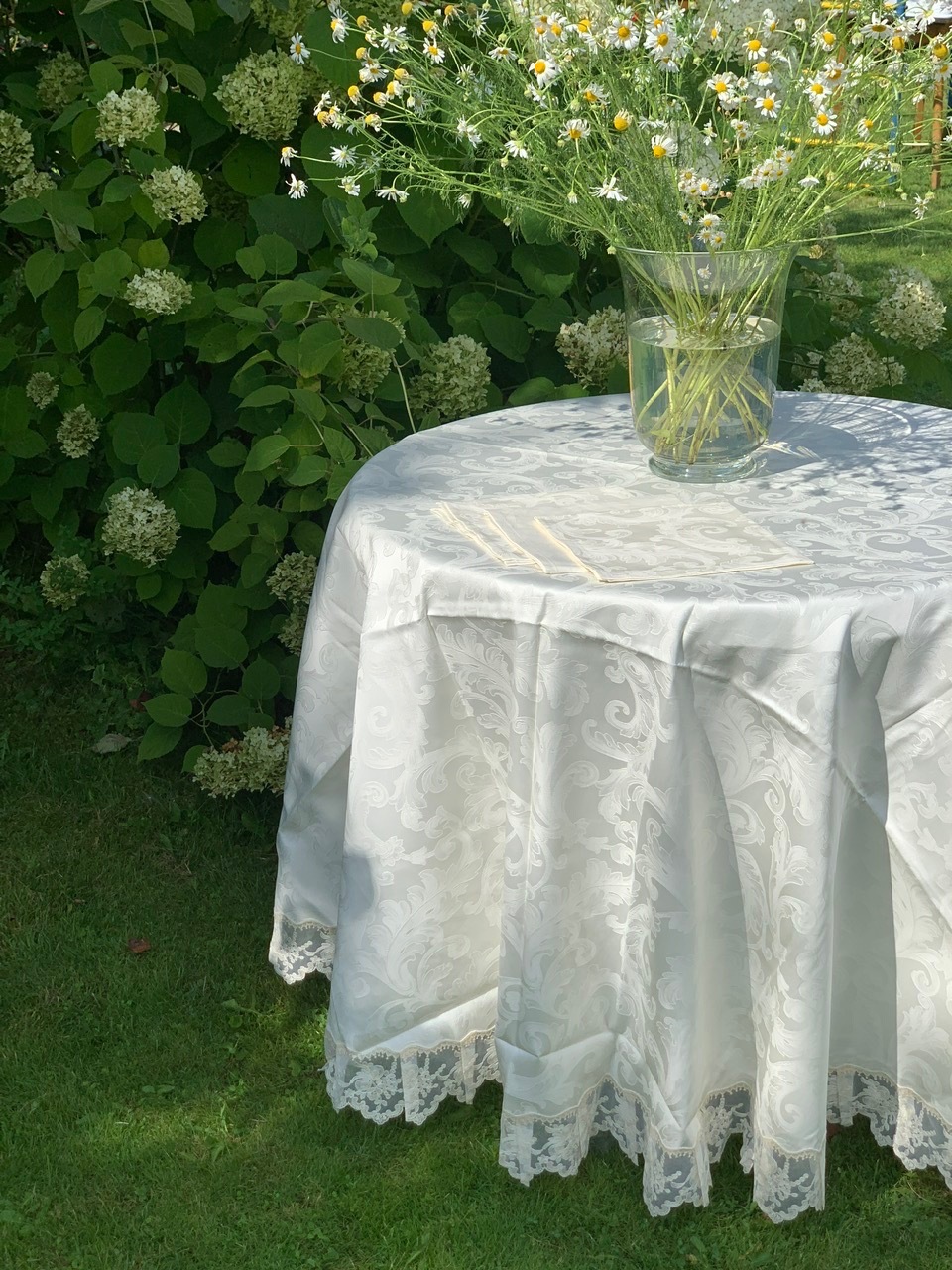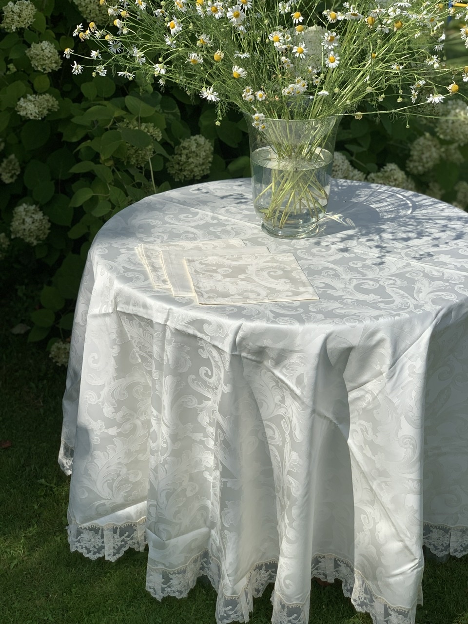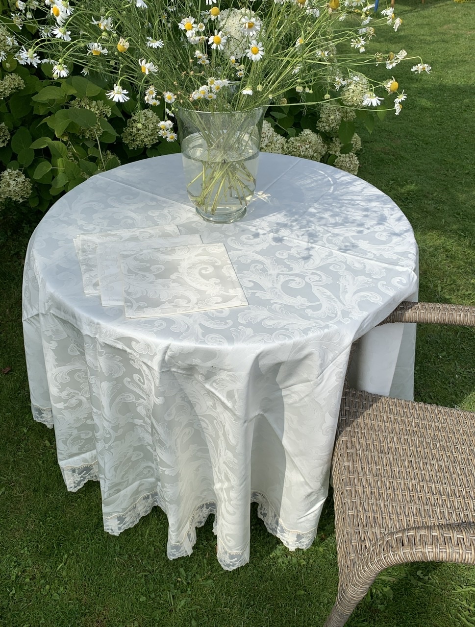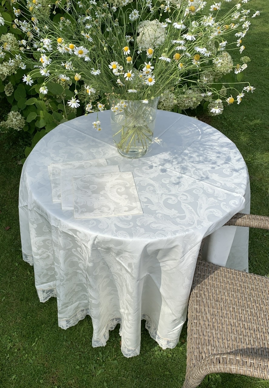 Круглая скатерть премиум-класса из сатин-жаккарда c изысканным флорентийским кружевом по краю.