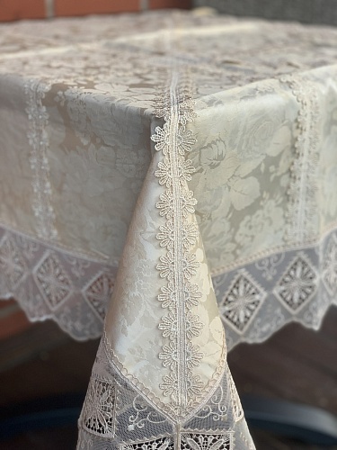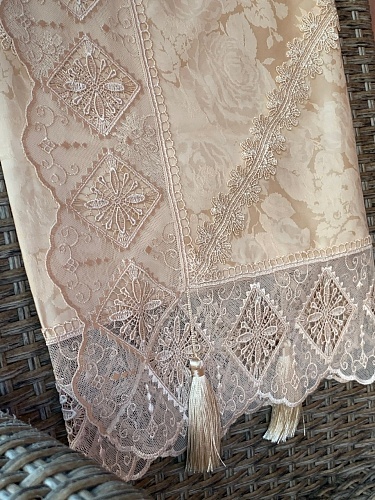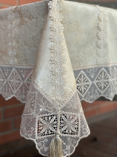 Скатерть с эффектной вышивкой и изящным кружевным декором. Украсит журнальный, кофейный столик, комод. В зависимости от интерьера можно использовать и как квадратный наперон. Эта скатерть добавит нотку очарования и элегантности в общее оформление стола.