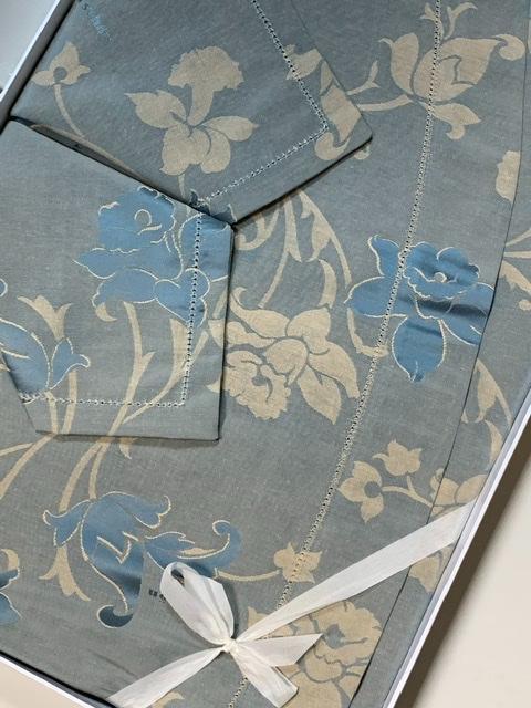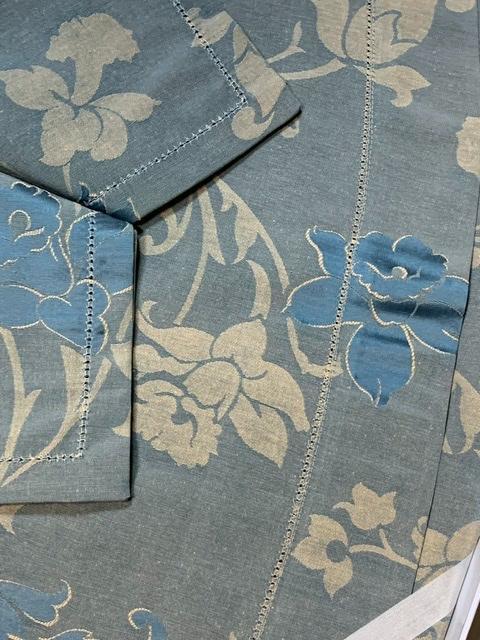 В этот комплект столового белья небесно-голубого цвета от известного итальянского производителя столового белья Gamba входит круглая жаккардовая скатерть с классическим цветочным рисунком и 8 салфеток.