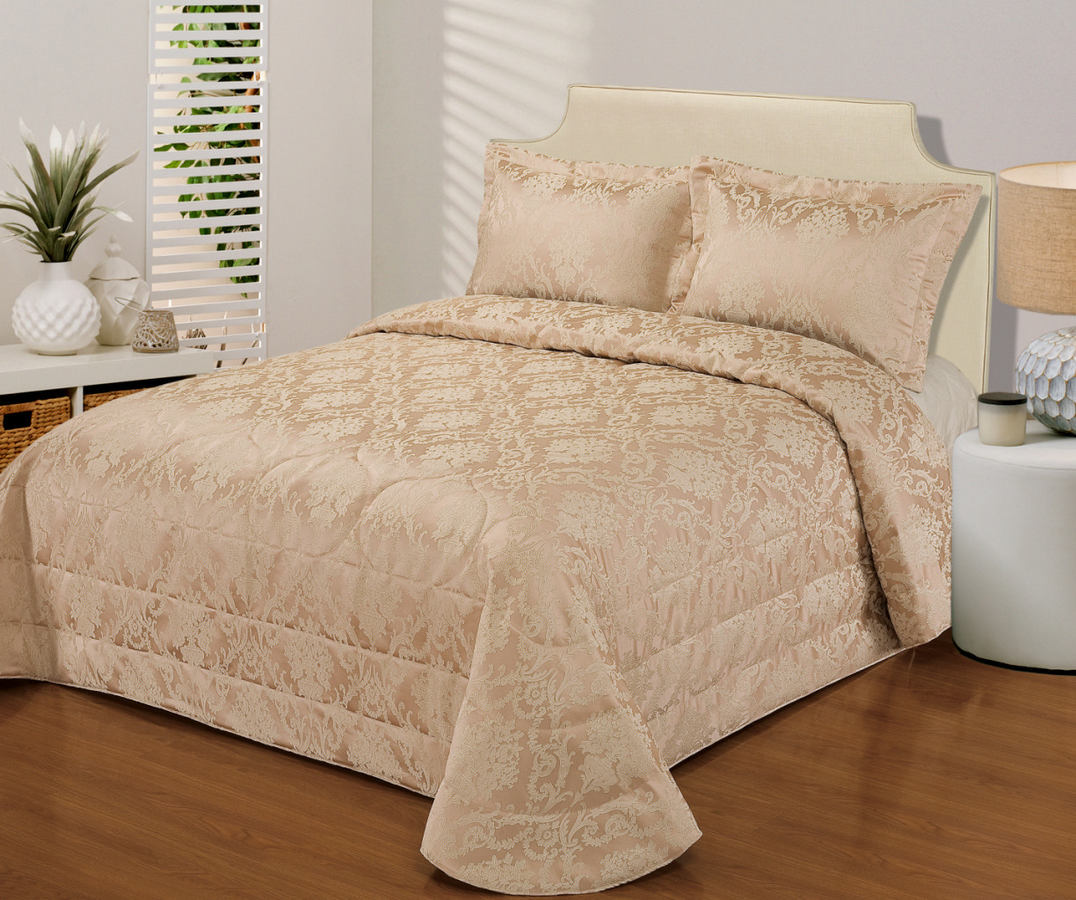 Покрывало тонкое стеганное с двумя наволочками Покрывало 240х260 Наволочка 50х70 (2) Состав: 100% полиэстер Уход: бережная стирка, возможена хим. чистка, глажка разрешена Упаковка: Подарочная упаковка из картона и ПВХ Роскошный комплект Софина состоит из покрывала и двух наволочек, выполнен в светлых пудренных оттенках. Светлые оттенки комплекта, мягкая драпировка выглядит очень элегантно и зрительно расширяет пространство. Покрывала Софина созданы из полиэстера, который очень практичнен, гипоаллергенен и не нуждается в особом уходе.