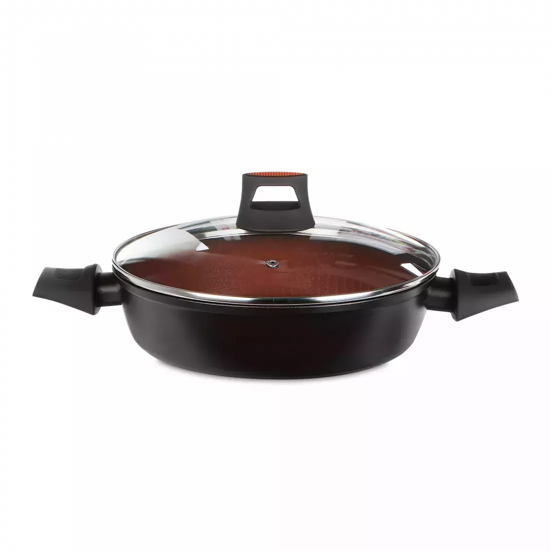 В основе каждого сотейника лежит прочный алюминиевый сплав. Этот металл обеспечивает максимально равномерный нагрев всей поверхности чаши благодаря высоким показателям теплопроводности. Внутренняя поверхность изделия покрывается уникальным антипригарным слоем, дающим возможность использовать минимум масла или жира в процессе приготовления еды, что делает ее более полезной без утраты вкусовых качеств.