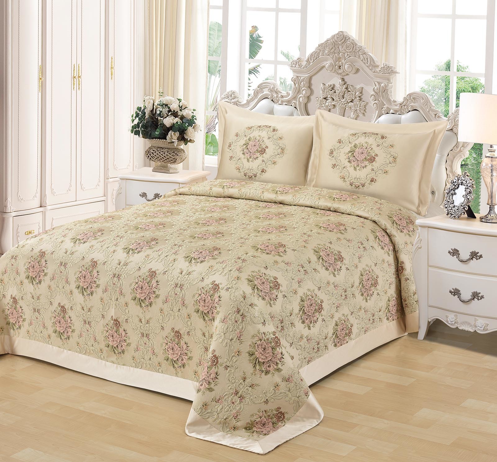 Состав: 65%вискоза 35% полиэстер Комплектация : Покрывало: 240х260 (1); наволочки: 50х70 (2); Уход: Стирка 30 гр. Щадящая сушка Упаковка: подарочная каробка Превосходный комплект Соул состоит из покрывала и двух наволочек, стилезован под гобелен и декорировано атласным кантом. Покрывало Соул создано из полиэстера и вискозы, которая очень практична, гипоаллергенна и не нуждается в особом уходе. В комплект входит: покрывало (1шт) - 240х260 см, наволочки (2шт) - 50х70 см.