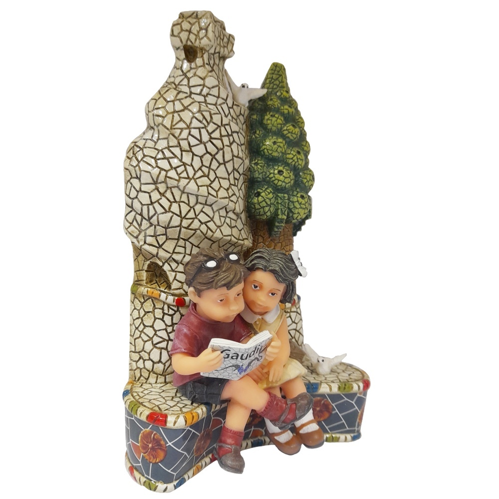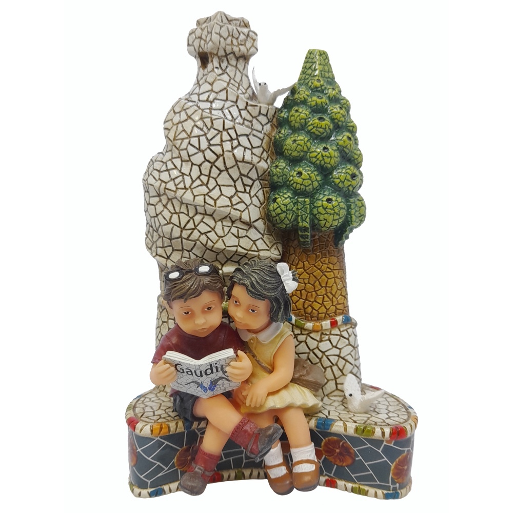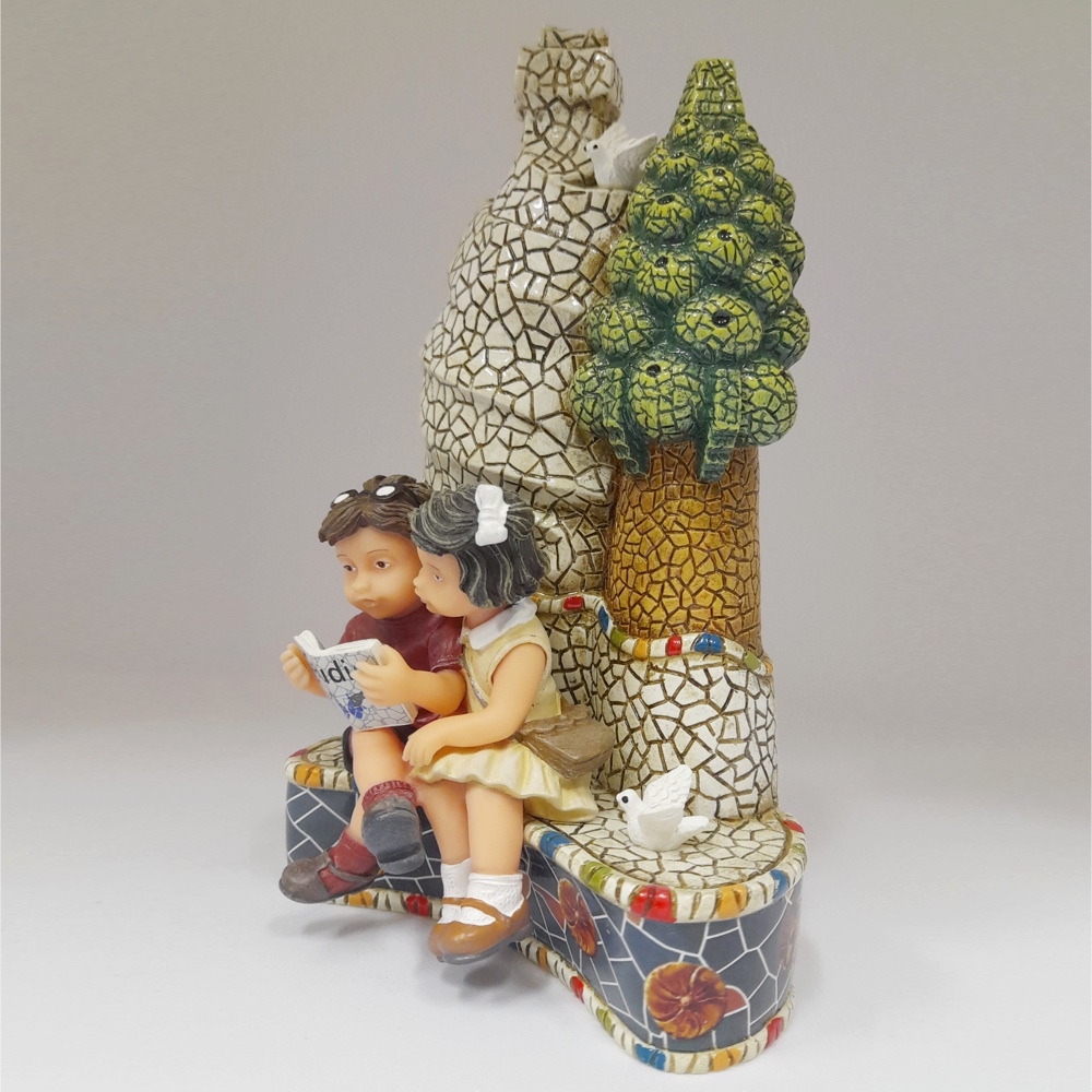 Статуэтка Nadal 784025 Книга всегда друг -фигурка в стиле Гауди. Изображение мальчика и девочки, сидящих на скамейке в саду и читающих книгу.