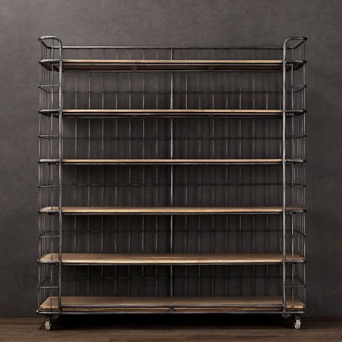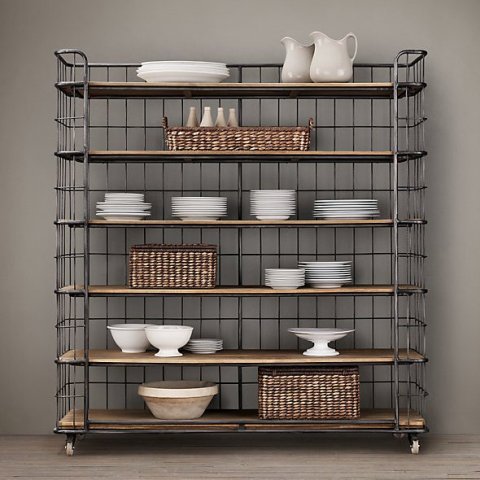 Большой стеллаж на колесиках для посуды или других предметов. Каркас выполнен из металла, полки - из массива дуба.