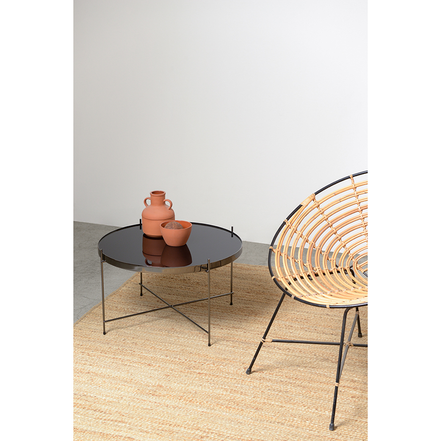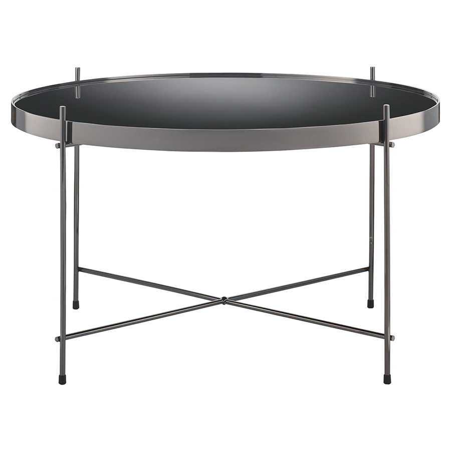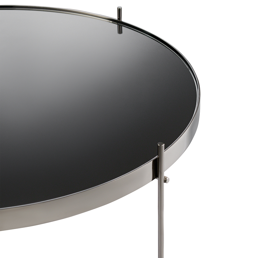Материалы: столешница – черное закаленное стекло, каркас – сталь. Размеры: диаметр – 64,4 см, высота – 38 см.