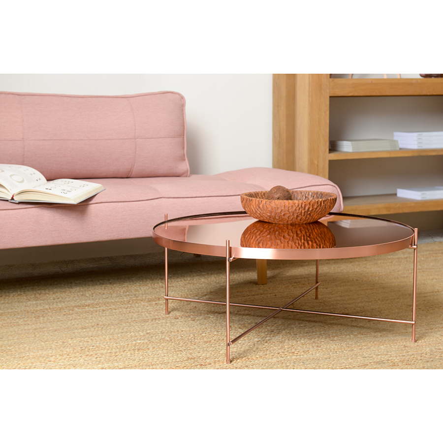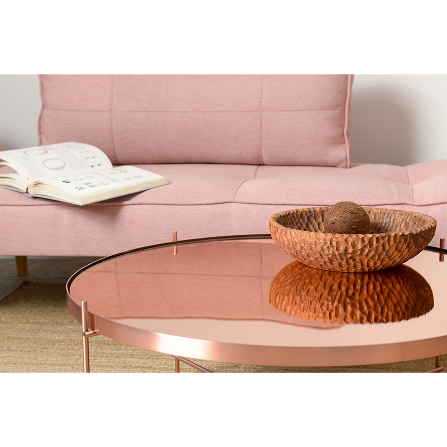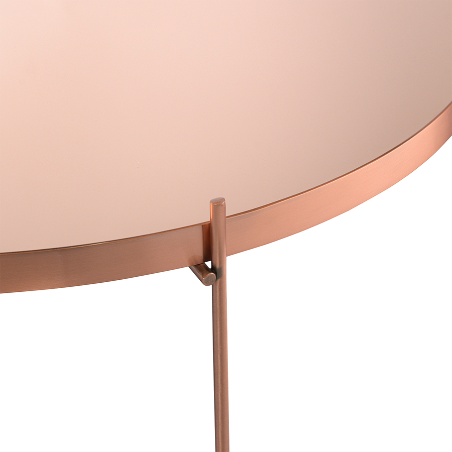 Материалы: столешница – розовое зеркало, каркас – сталь с медным покрытием. Размеры: диаметр – 84,8 см, высота – 33 см.