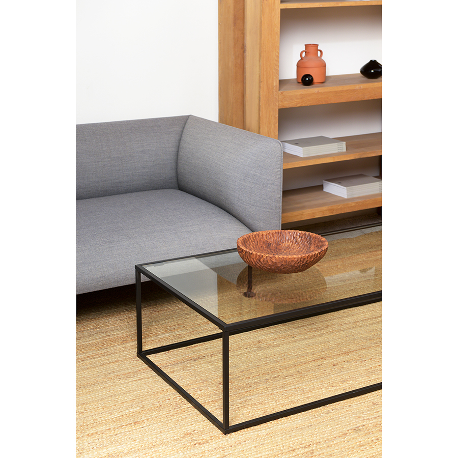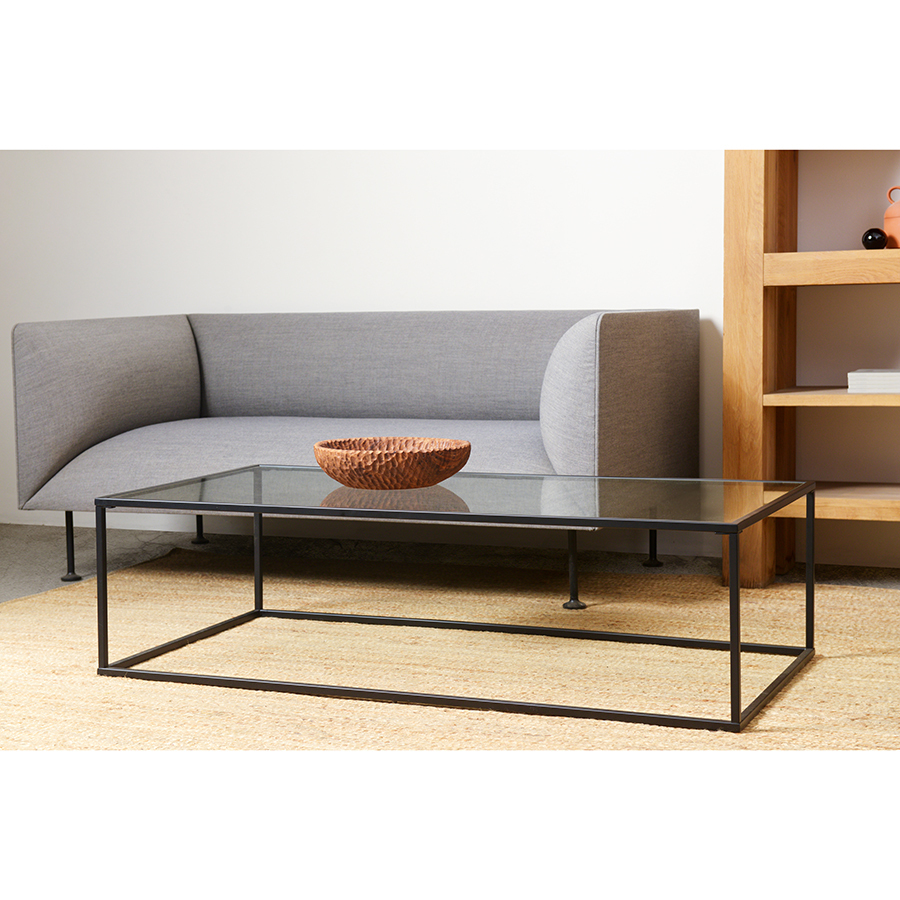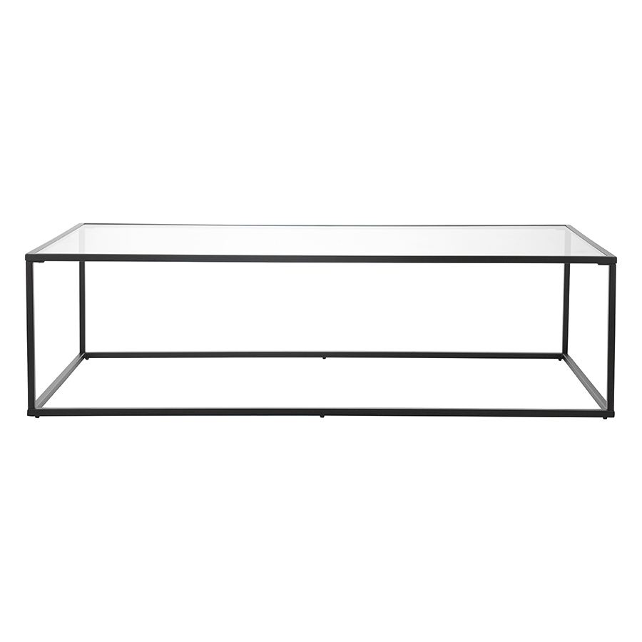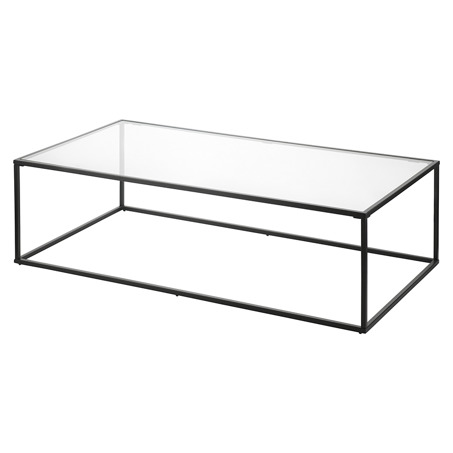 Материалы: столешница – прозрачное закаленное стекло, каркас – сталь с черным порошковым покрытием. Размеры: 130х65х36 см.