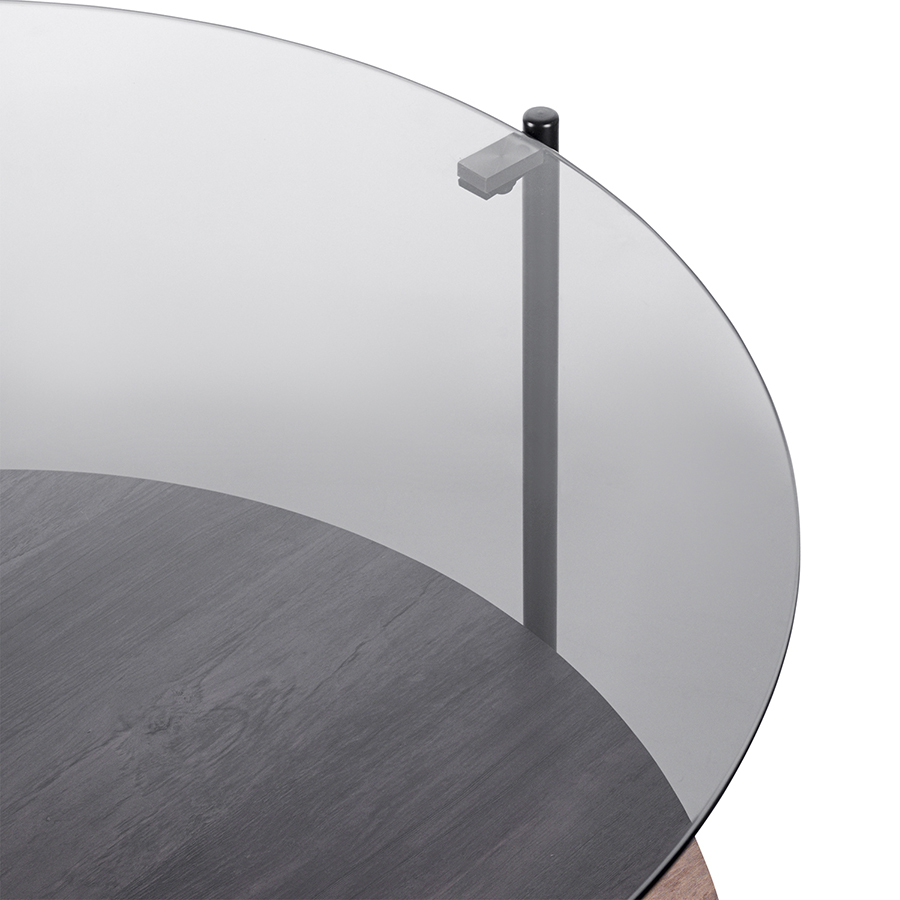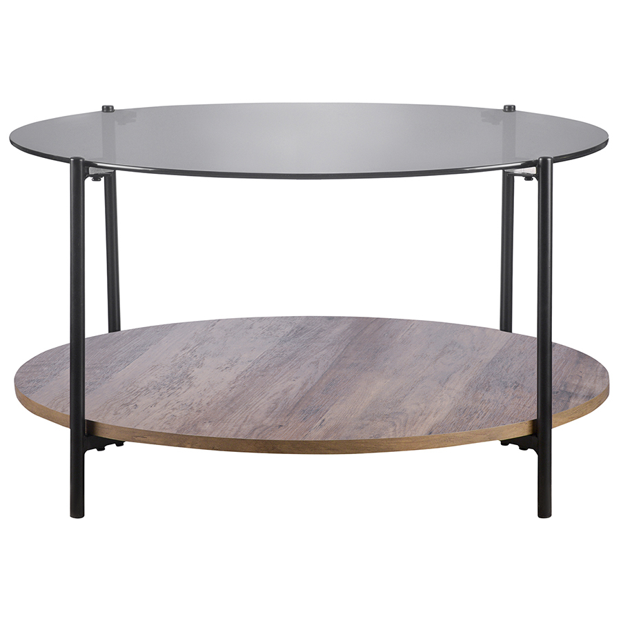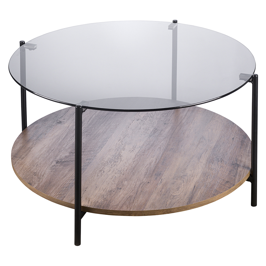 Материалы: закаленное стекло, МДФ, железо. Диаметр: 80 см. Высота: 45 см. Цвет: коричневый/черный.