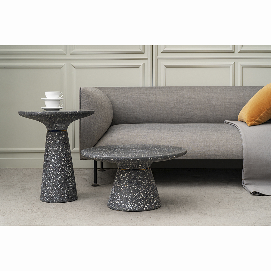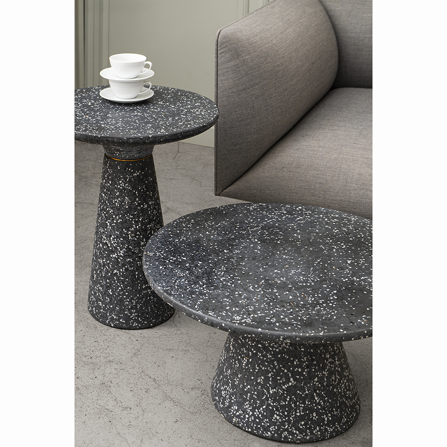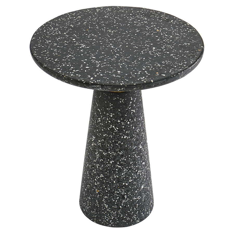 Столешница и основание столика выполнены из материала терраццо, характеризующегося высокой прочностью и устойчивостью к износу. В его состав входят мелкие кусочки натурального камня, скрепленные цементным раствором с добавлением пластификаторов. Поверхность терраццо гладкая, приятная на ощупь, прекрасно смотрится и не требует сложного ухода. Столешница диаметром 45 см позволяет размещать все необходимое – чашки кофе, десерты и прочее. При этом модель имеет компактные размеры, что способствует экономии полезного пространства.
