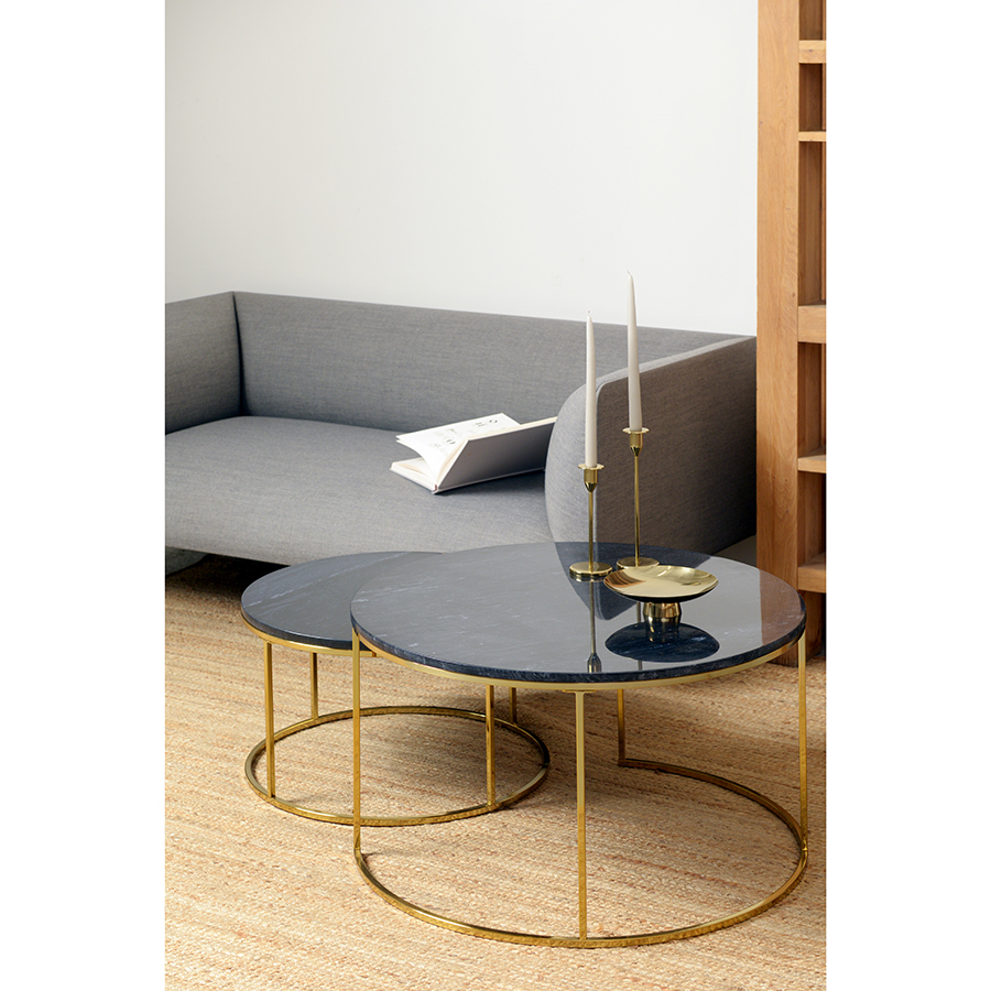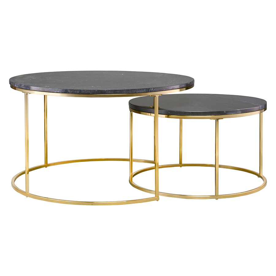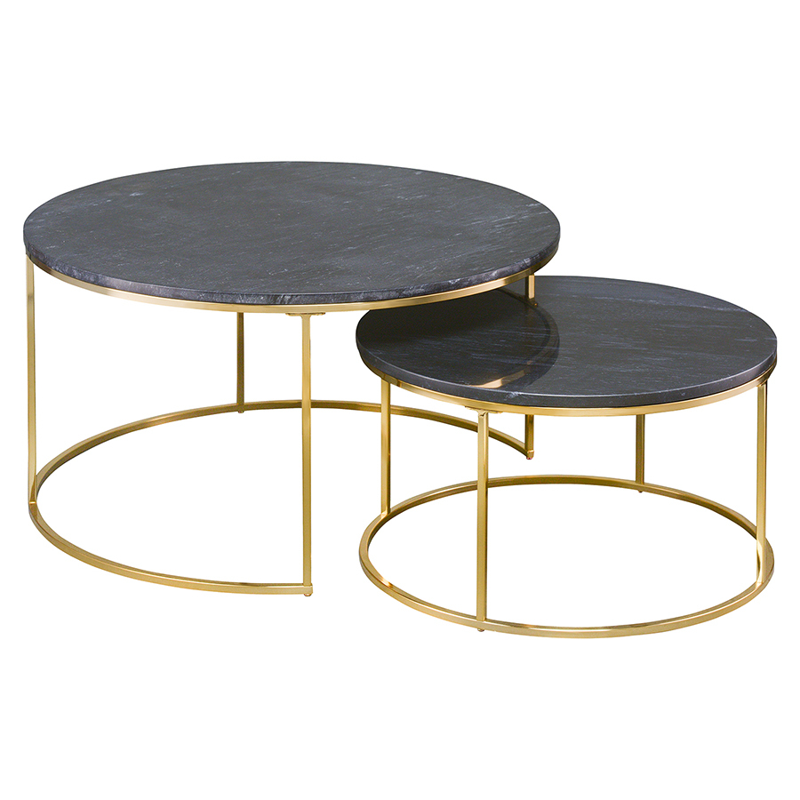 Материалы: столешница – черный мрамор, каркас – сталь. Размеры: 80х80х45 см, 60х60х35 см.