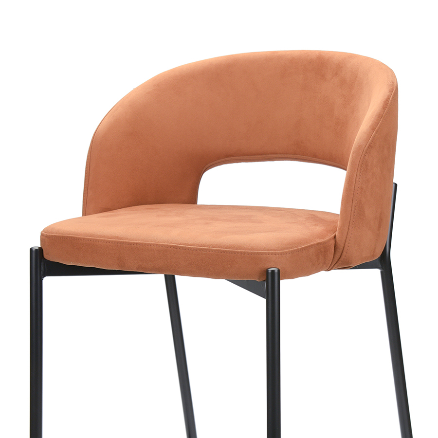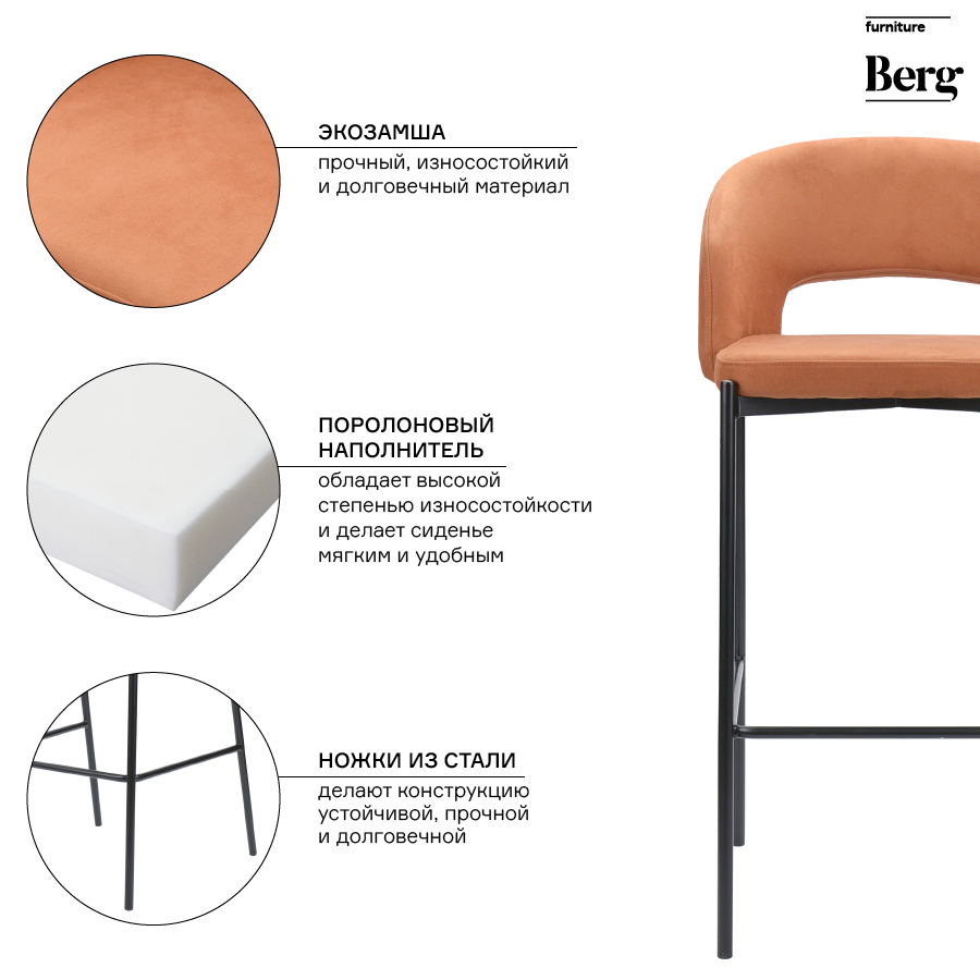 Конструкция устойчива, прочна и долговечна. Широкая спинка обеспечивает дополнительный комфорт. Качественная экозамша на вид не отличается от натуральной замши. Материал эластичный и мягкий на ощупь, он не вызывает аллергических реакций и раздражений. Производитель ткани – Ote Fabrics. Продукция проходит тесты SGS и Intertek. Ножки выполнены из стали с хромированным покрытием. Наполнитель – поролон. Максимальная нагрузка – 120 кг.