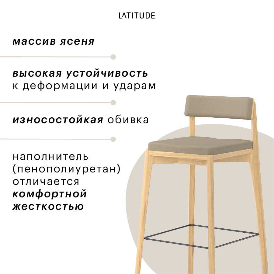 Материалы: массив ясеня, фанера, 100%, полиуретан, 100%, полиэстер, сталь. Размеры: 51х52х102 см. Высота сиденья: 79 см. Ширина сиденья: 39 см. Глубина сиденья: 37 см. Высота спинки: 24 см. Ширина спинки: 37 см. Высота подножки: 33 см. Максимальная нагрузка: 136 кг. Цвет основания: ясень. Цвет обивки: бежевый.