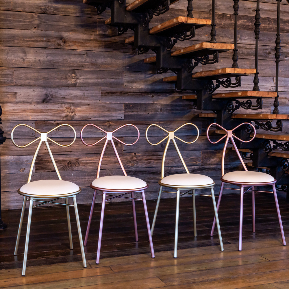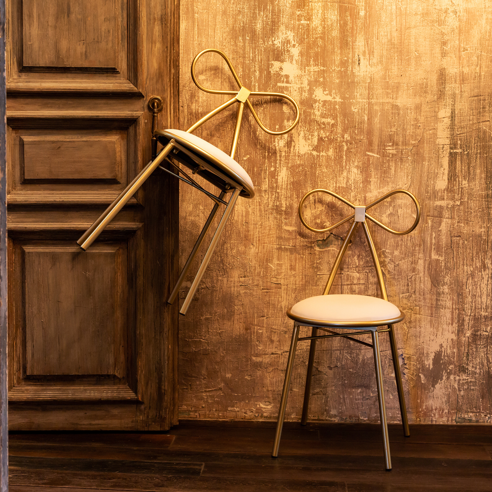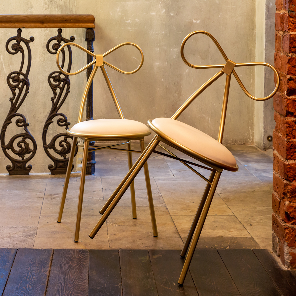 Кокетливые бантики, – задорная классика на все времена, – в этом сезоне осваивает новые территории. Если раньше стилисты не задумываясь вплетали их в прически, декорировали ими платья и завязывали под воротничком, то теперь фантазия дизайнеров работает куда менее прямолинейно. Изящные банты из металла легко вписались в интерьерный гардероб, а исполненные в золотом цвете - и вовсе получили праздничный статус, – в союзе с белоснежным сиденьем, - легким и воздушным. Хрупкая внешность стула Кокет обманчива: корпус, изготовленный из прочной и выносливой мягкой стали, устойчив и долговечен. Обивку сиденья составляет экокожа, - прочная и эффектная ткань.