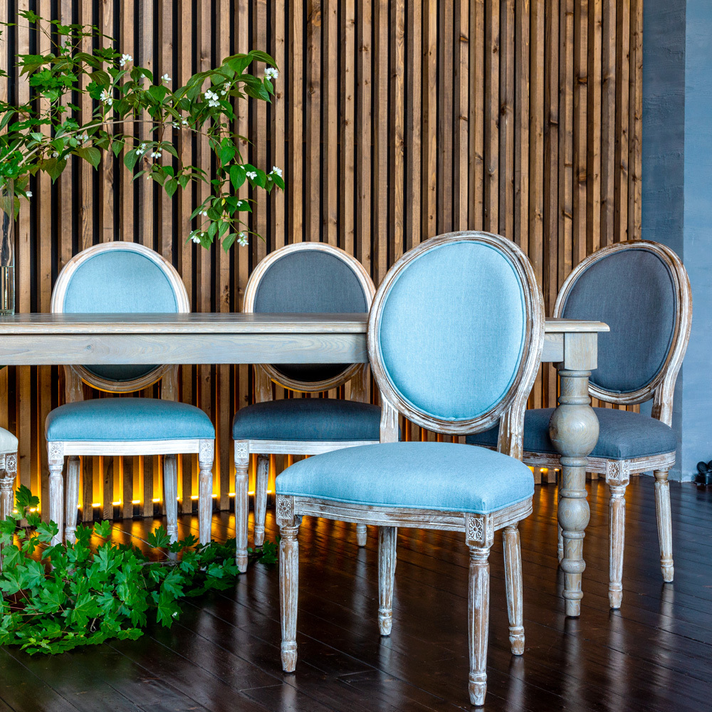 Стул Луи привлекает благородным плавным корпусом, - респектабельность для него неотделима от уюта. Заметную роль играет изящная резьба, акцентированная степенной пепельной патиной. Льняная фактура серой обивки гармонична натуральному дереву, подкупающему теплым оттенком лесного ореха.