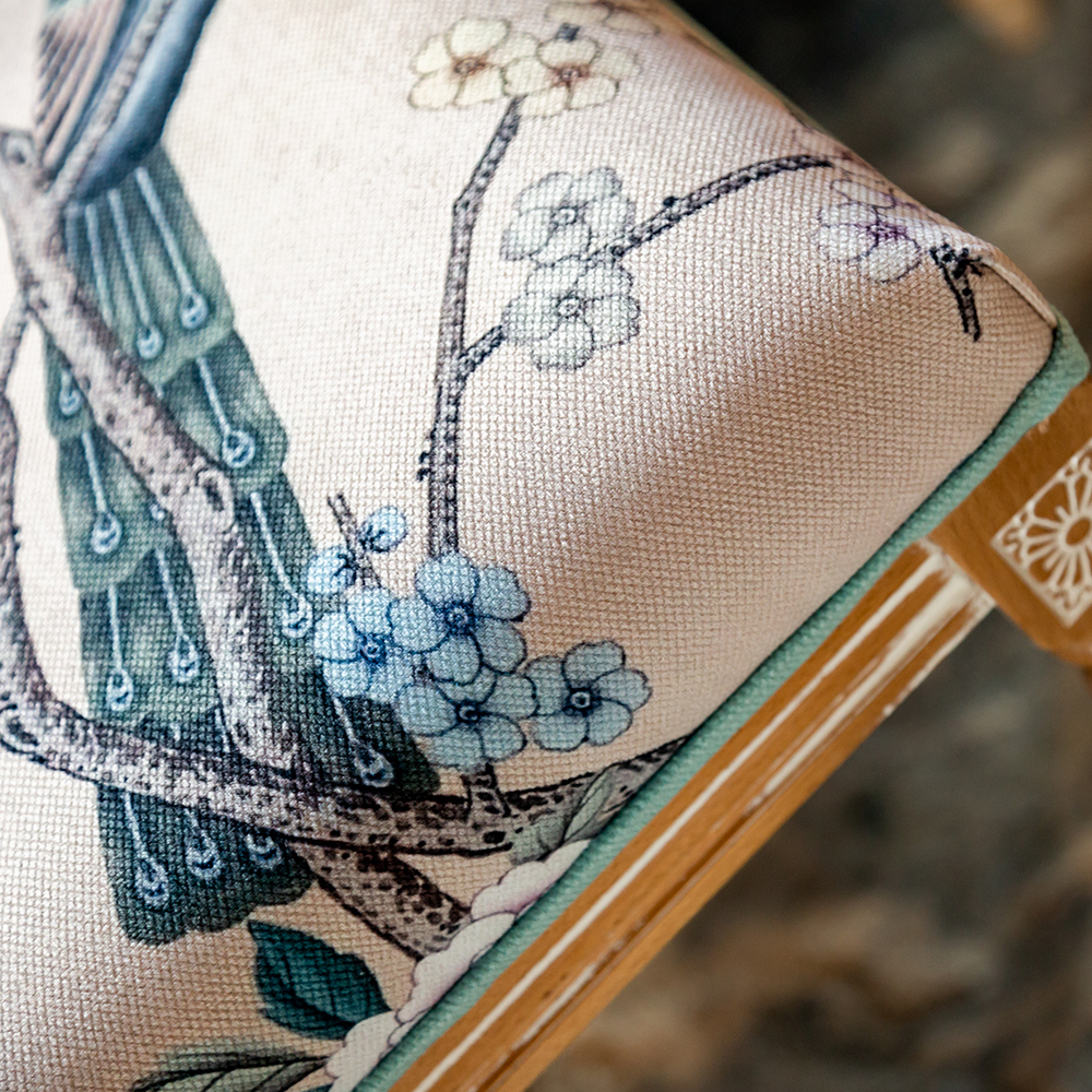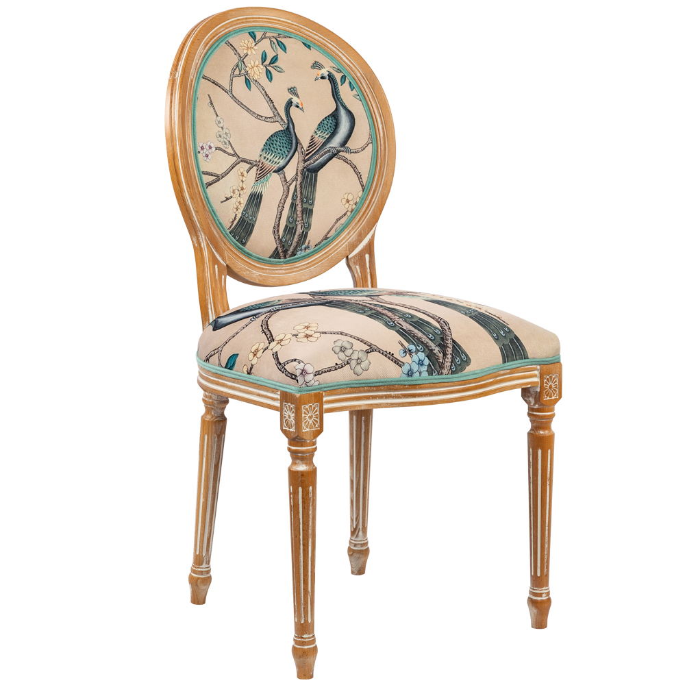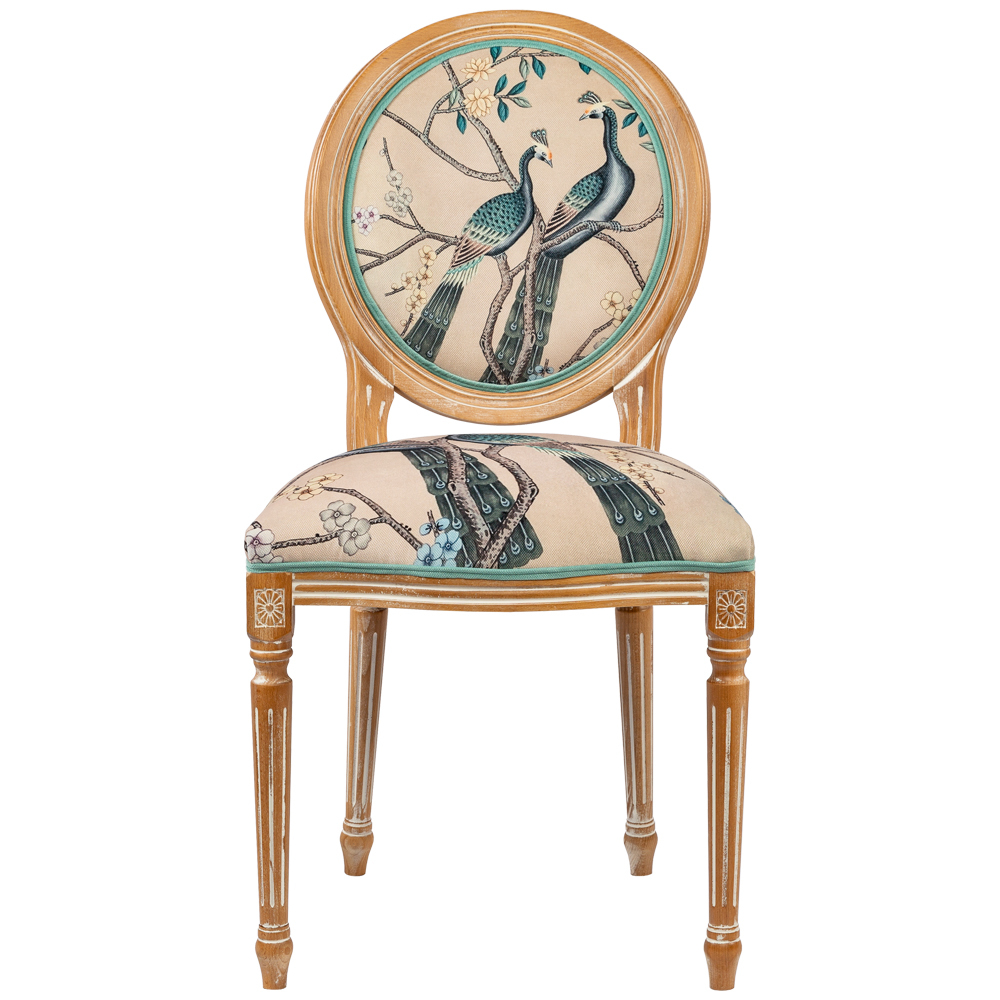 В сердце этого стула лежат цветочные ноты камелий и сакуры, украшающие величественную парочку императорских павлинов. Тонкие ветви деревьев усыпаны цветами, кажущимися хрупкими и утонченными. Королевские птицы с пышным и ярким оперением стали центром композиции. Это настоящая игра с нежностью соцветий и волшебной чистотой силуэтов пернатых.