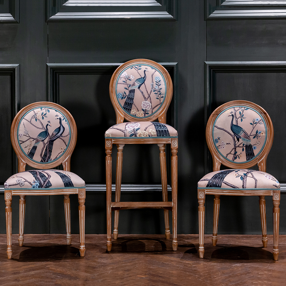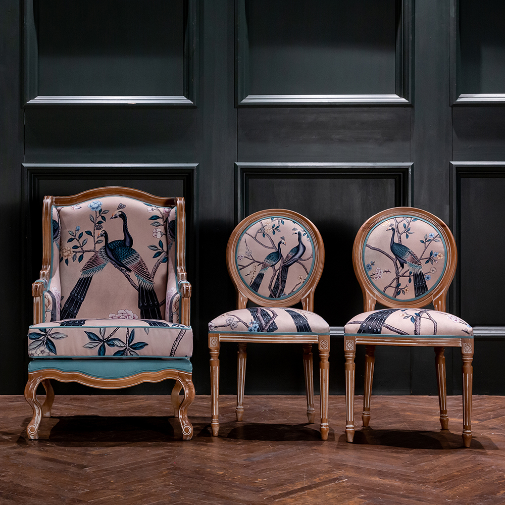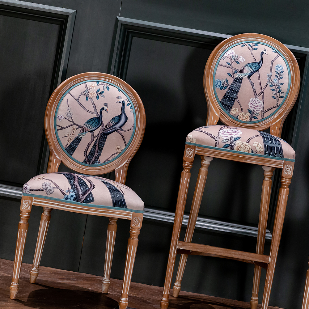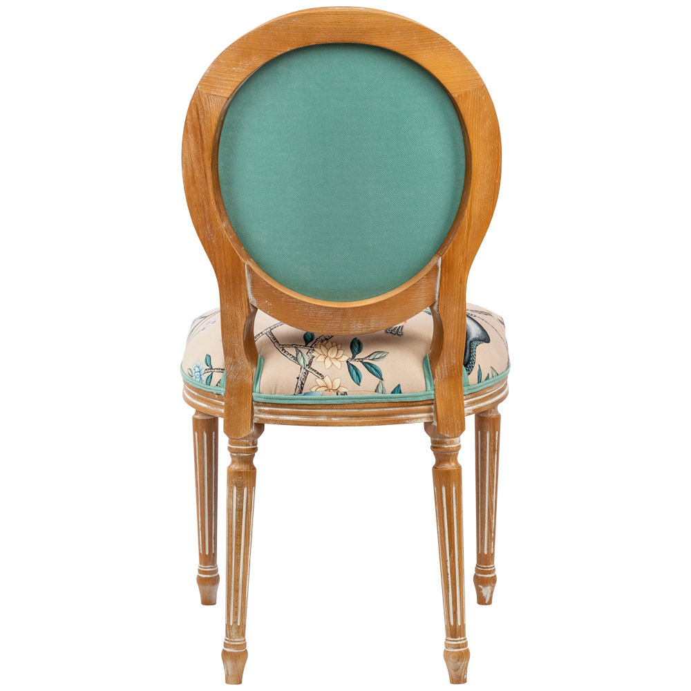 В сердце этого стула лежат цветочные ноты камелий и сакуры, украшающие величественную парочку императорских павлинов. Тонкие ветви деревьев усыпаны цветами, кажущимися хрупкими и утонченными. Королевские птицы с пышным и ярким оперением стали центром композиции. Это настоящая игра с нежностью соцветий и волшебной чистотой силуэтов пернатых.