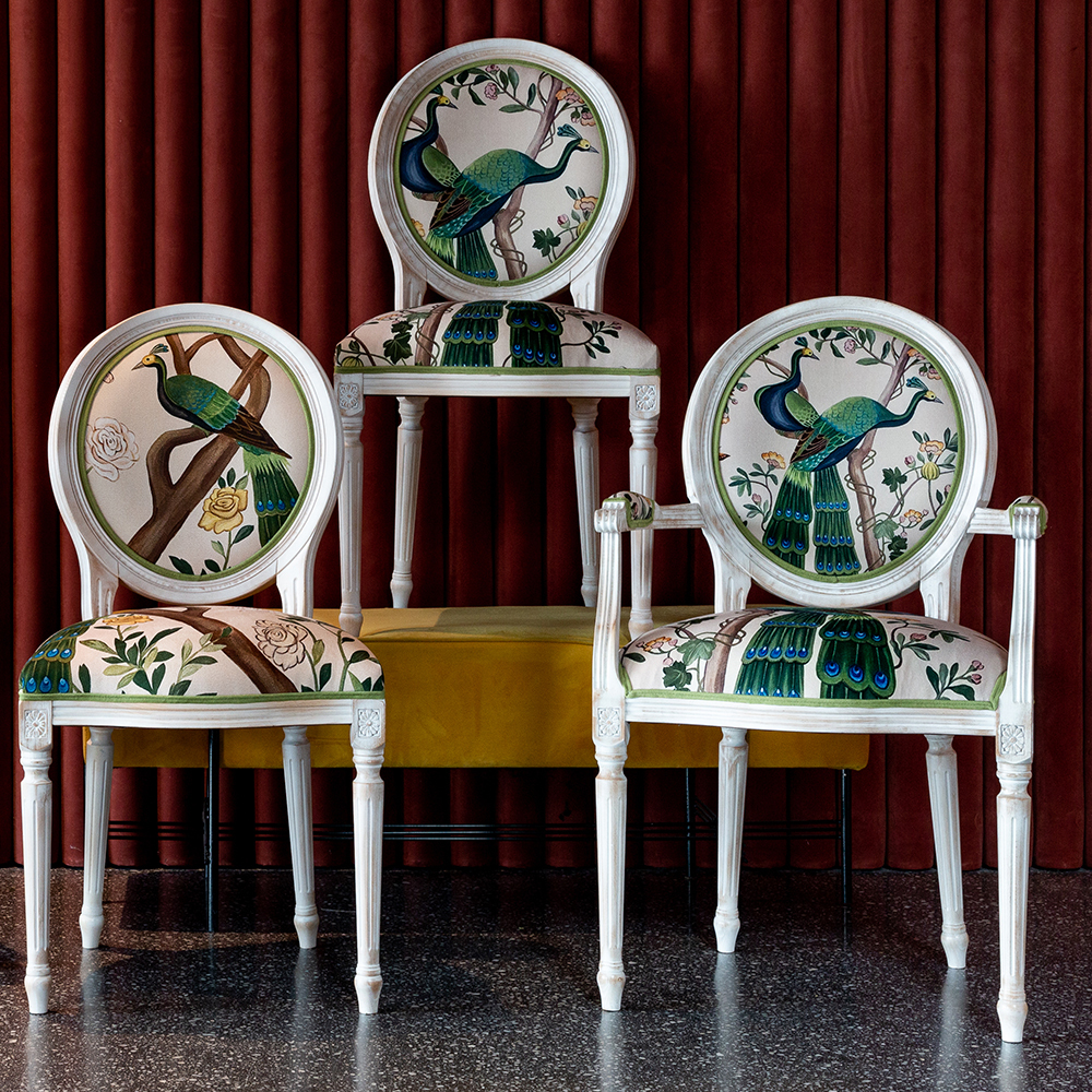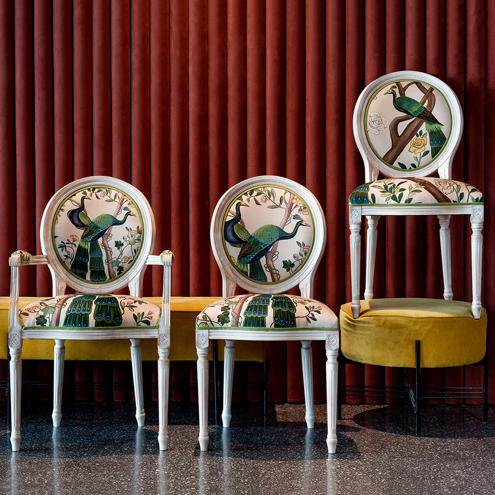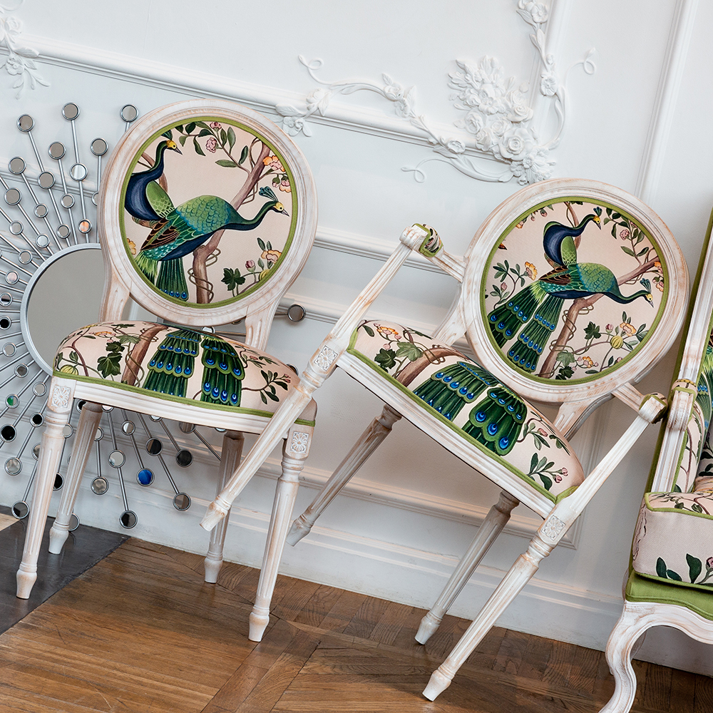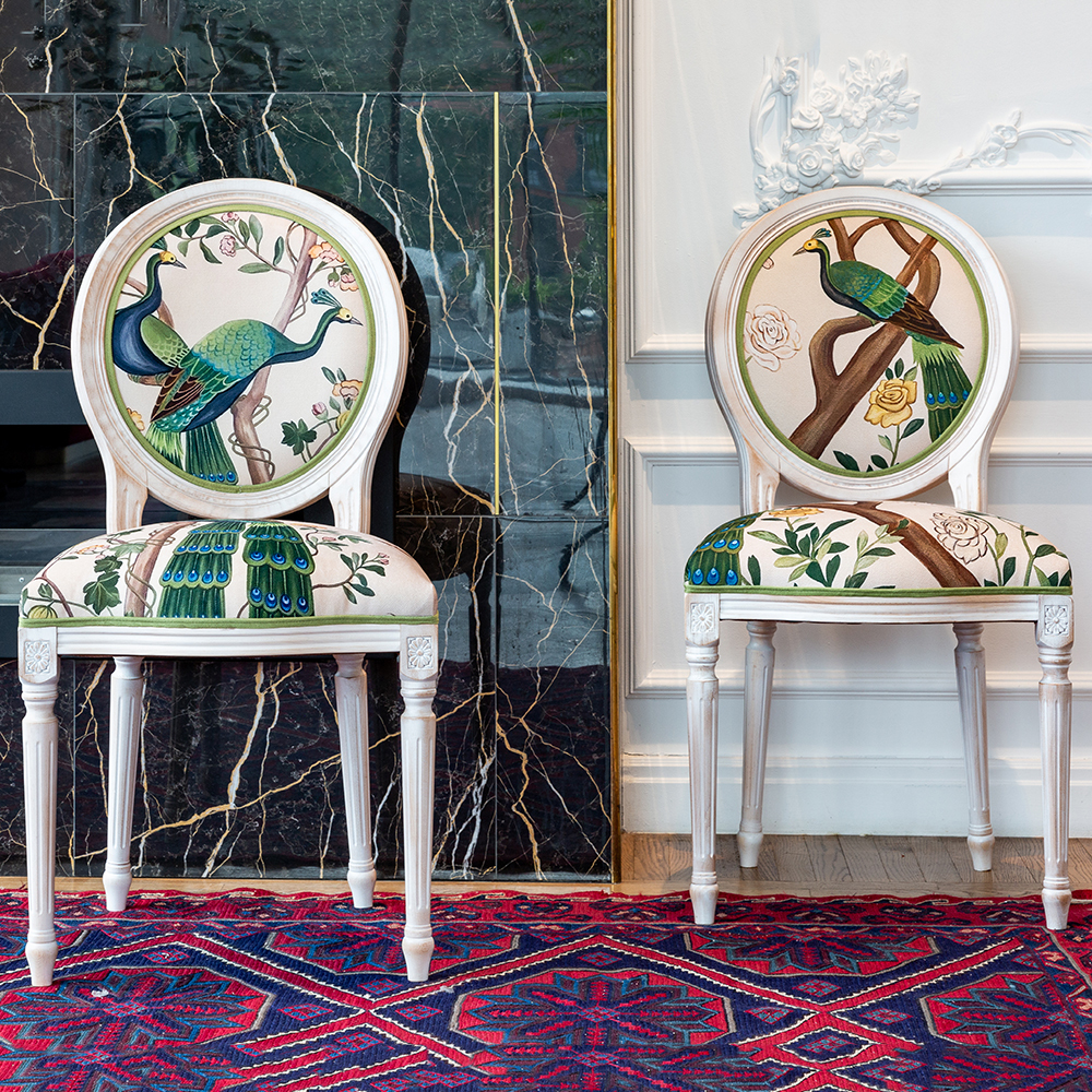 В сердце этого стула лежат цветочные ноты камелий и сакуры, украшающие величественную парочку императорских павлинов. Тонкие ветви деревьев усыпаны цветами, кажущимися хрупкими и утонченными. Королевские птицы с пышным и ярким оперением стали центром композиции. Это настоящая игра с нежностью соцветий и волшебной чистотой силуэтов пернатых.