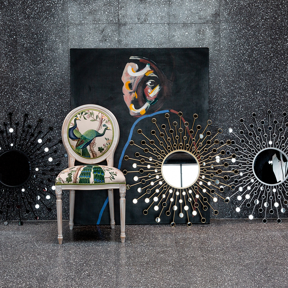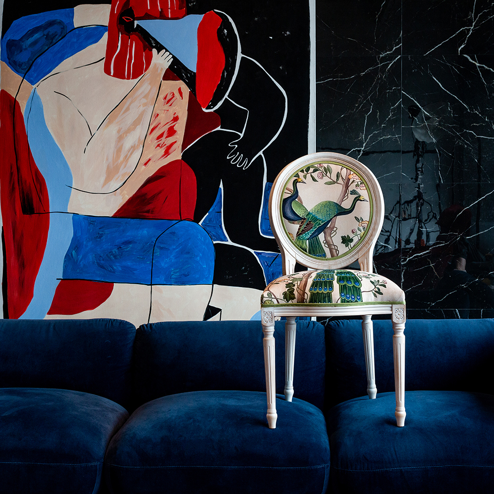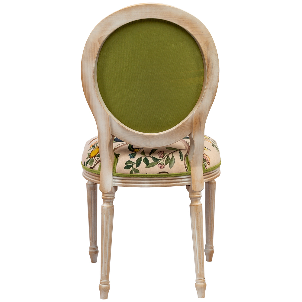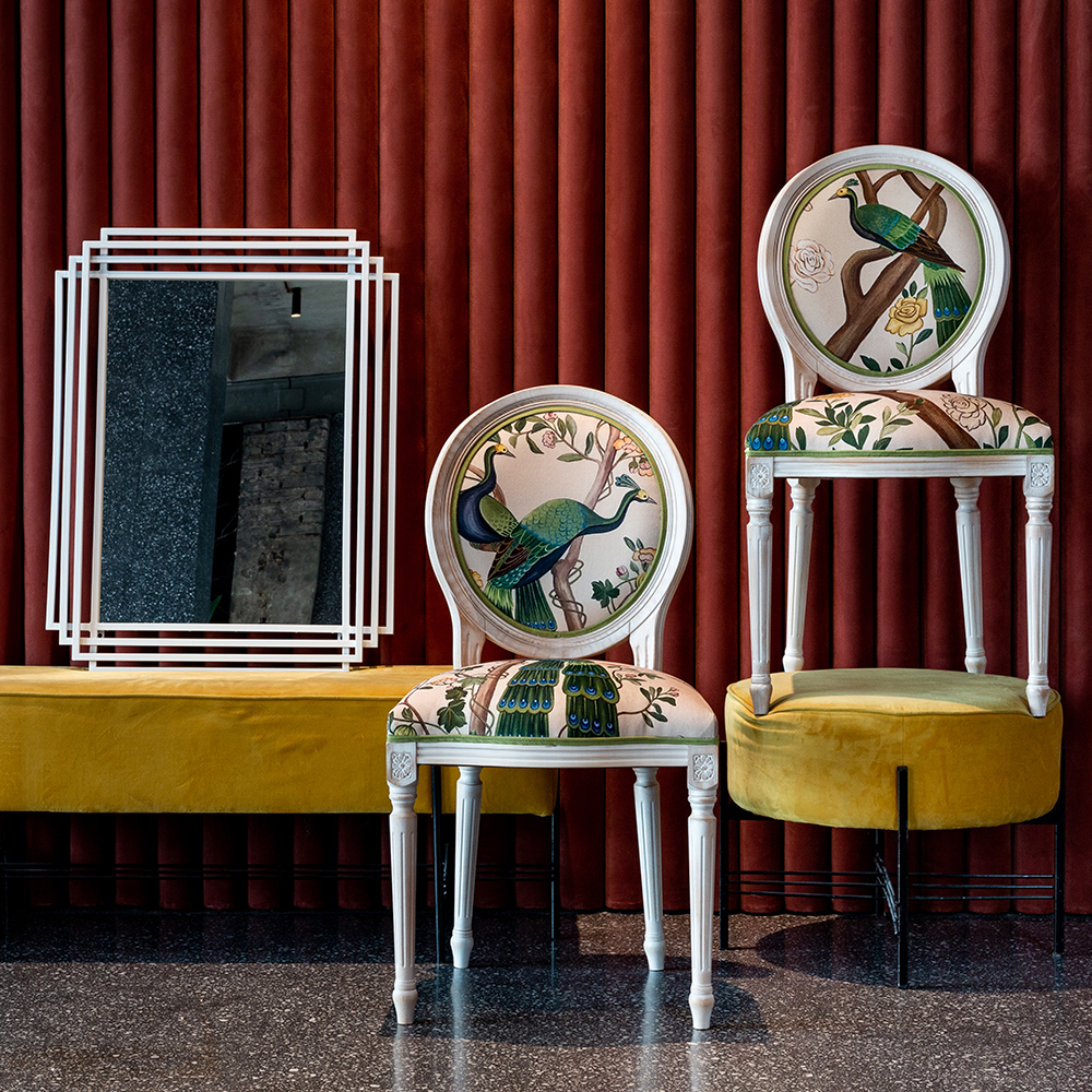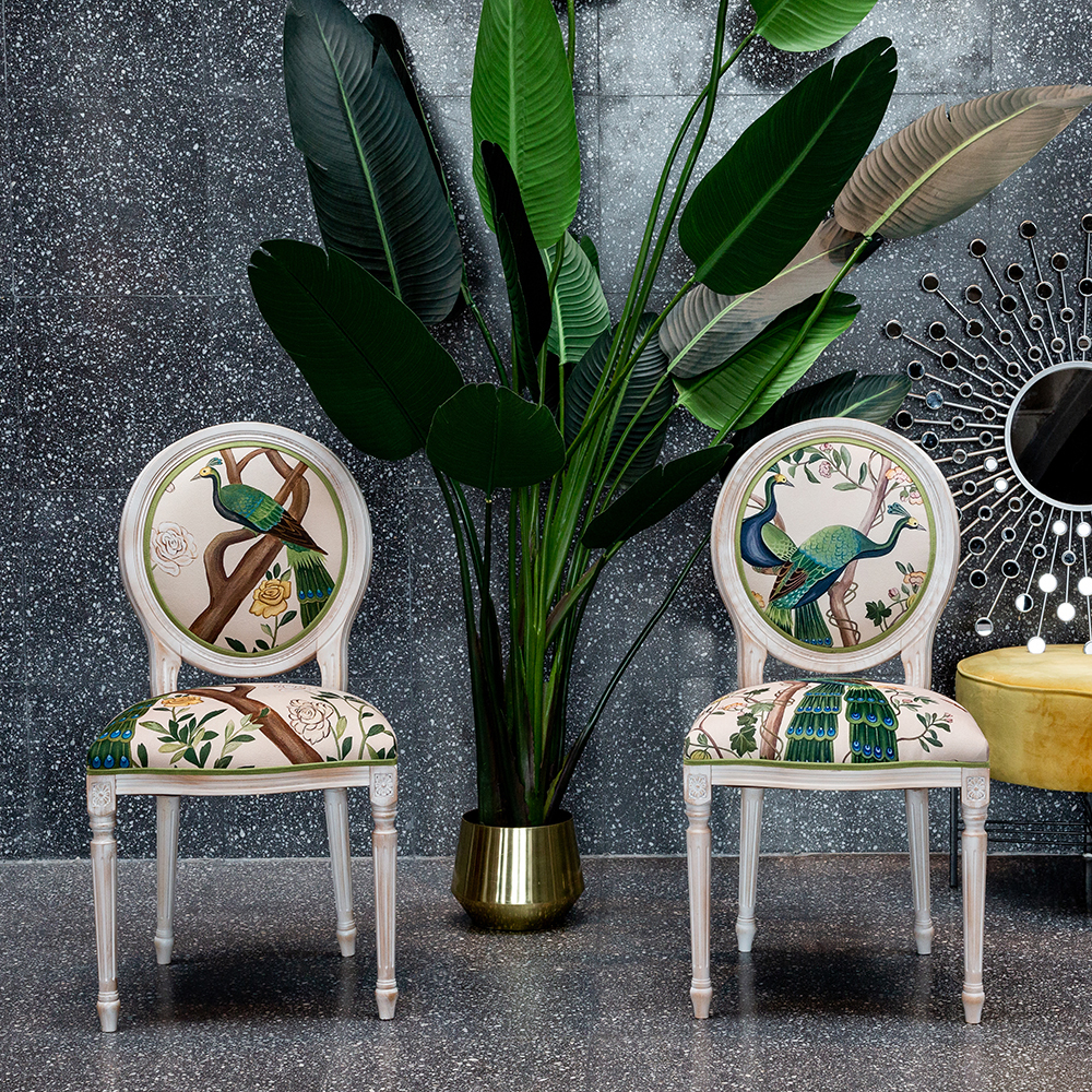 В сердце этого стула лежат цветочные ноты камелий и сакуры, украшающие величественную парочку императорских павлинов. Тонкие ветви деревьев усыпаны цветами, кажущимися хрупкими и утонченными. Королевские птицы с пышным и ярким оперением стали центром композиции. Это настоящая игра с нежностью соцветий и волшебной чистотой силуэтов пернатых.