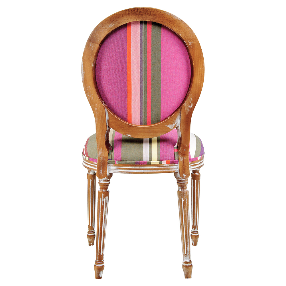 Ткань для сиденья и оборотной части спинки стула выкраивается из широкого рулона без рапорта, поэтому расцветка каждого полосатого стула уникальна.