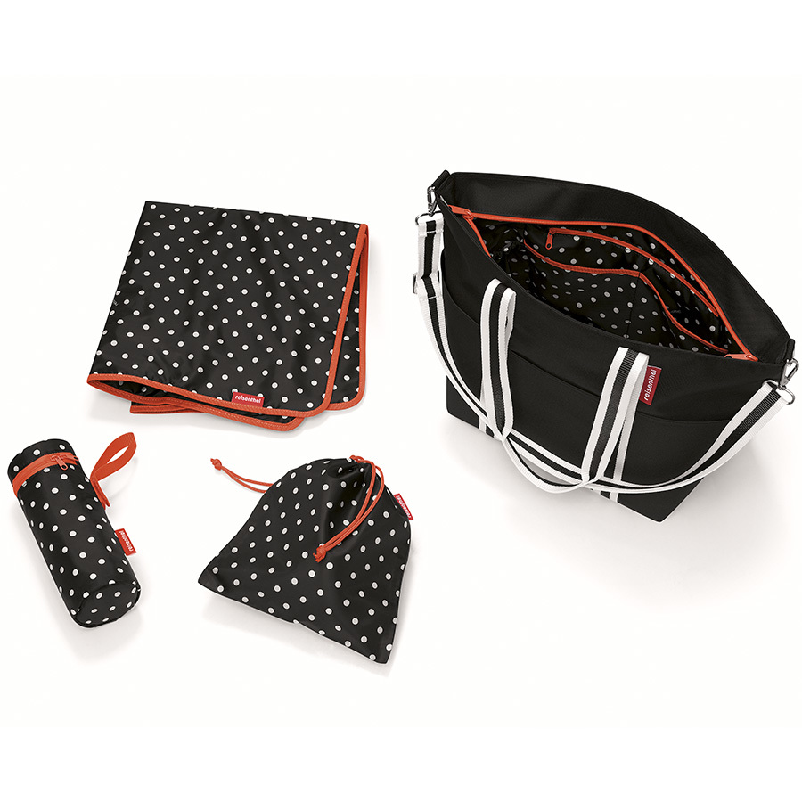 Сумка оборудована двумя удобным ручками и ремнем для ношения через плечо. Внутри мягкий коврик для пеленания, мешочек для белья, держатель для бутылок с застежкой-липучкой. Есть четыре наружных и шесть внутренних карманов. Материал – прочный водоотталкивающий полиэстер из переработанного пластика. Объем: 15 л.