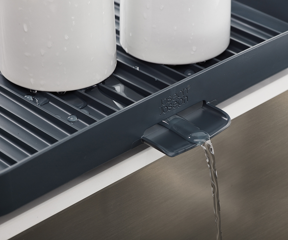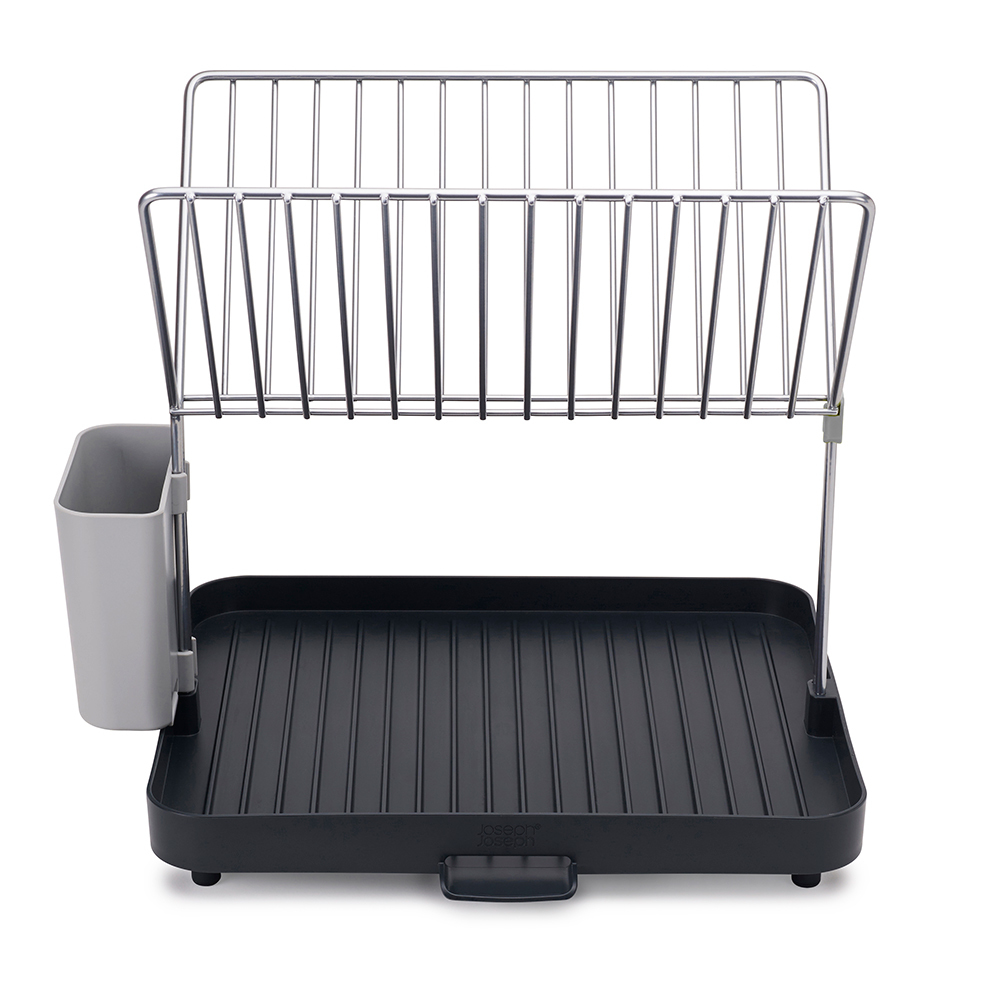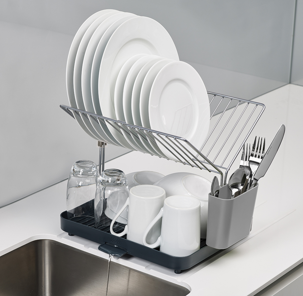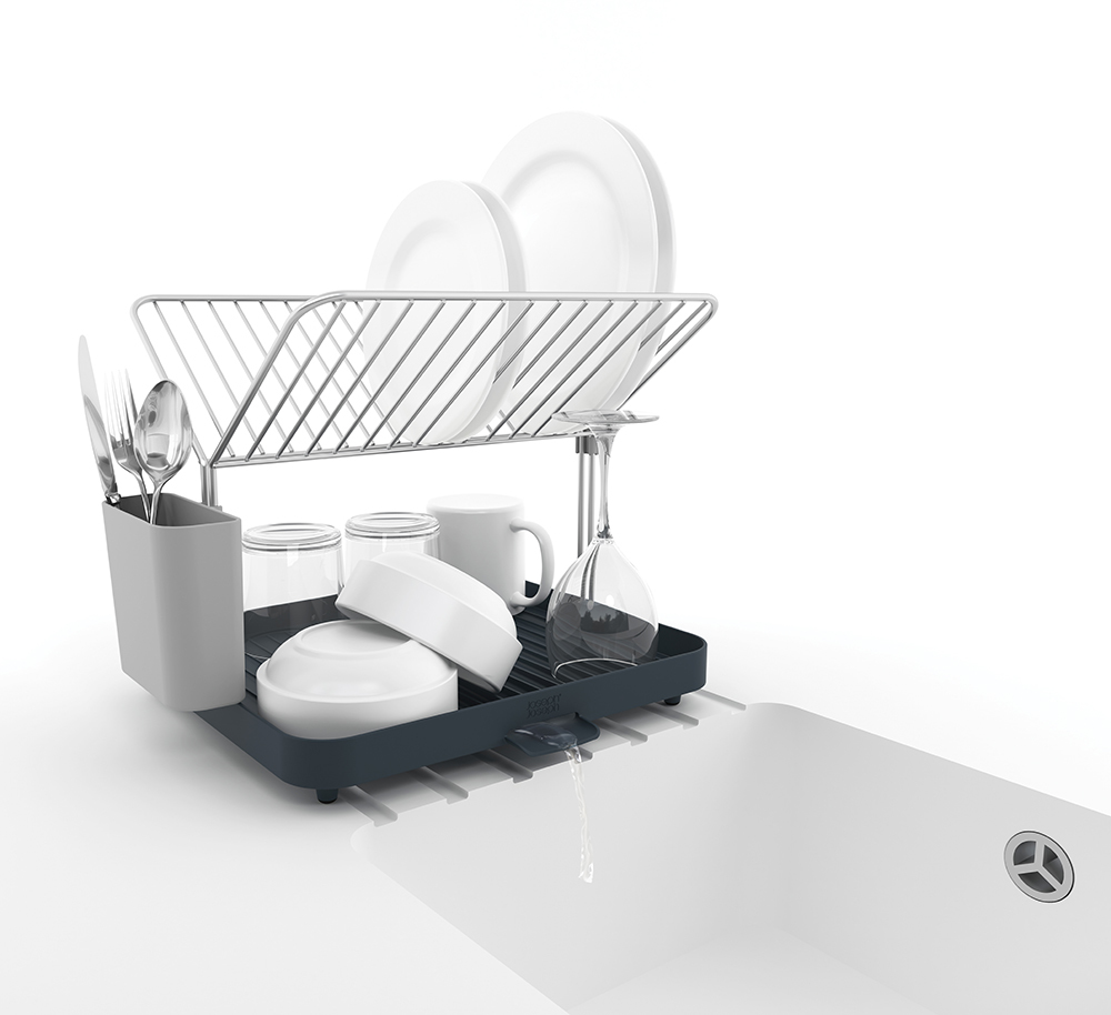 Эргономичная сушилка для посуды, позволяющая сэкономить место на кухне. Двухуровневая конструкция состоит из устойчивого основания для кастрюль, сковородок и чашек и из верхней решетки, вмещающей до 15 тарелок и блюдец. Объемное отделение со сливом предоставляет возможность тщательно осушить до 4 комплектов посуды — и все это на минимальном участке пространства. Вода свободно стекает по желобкам, расположенным у основания под наклоном, а встроенный носик позволяет быстро сливать жидкость прямо в раковину. Нескользящие ножки обеспечивают устойчивость. , ,Конструкция разбирается на части для легкой очистки.