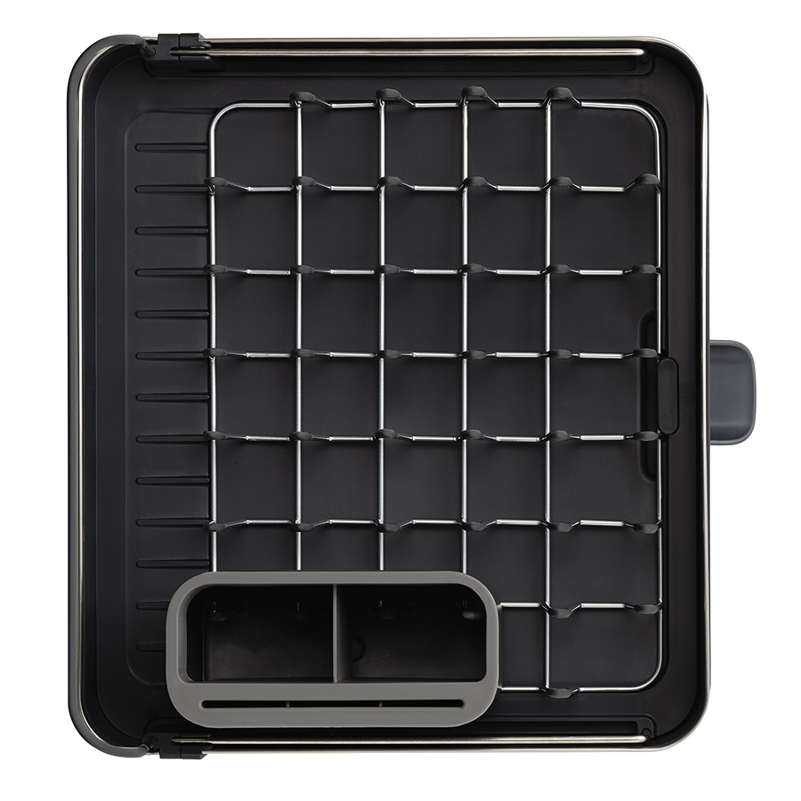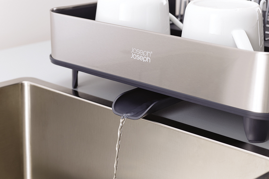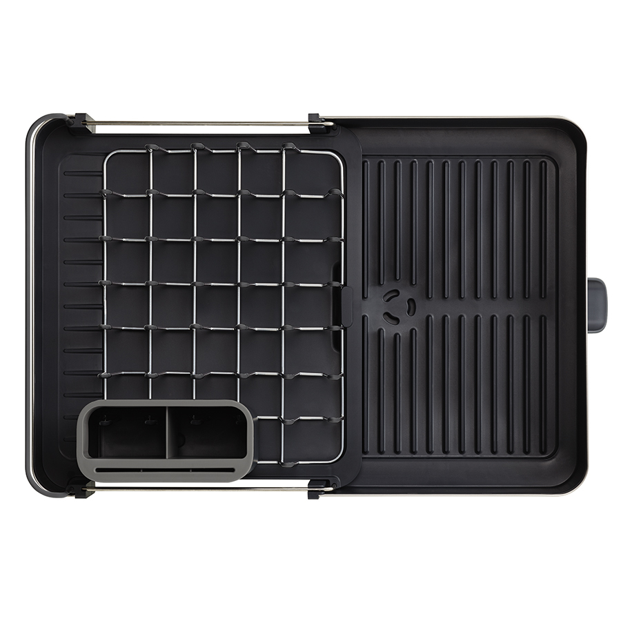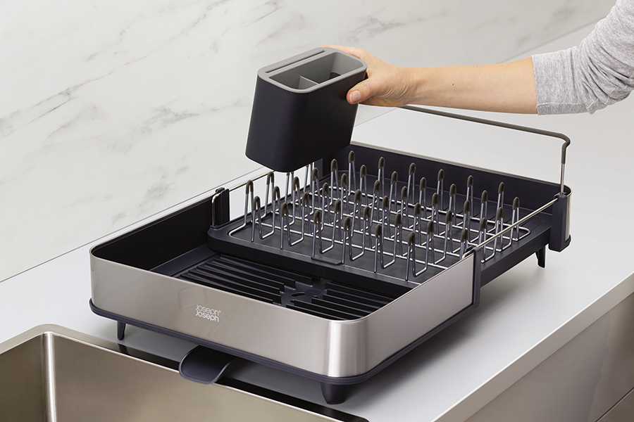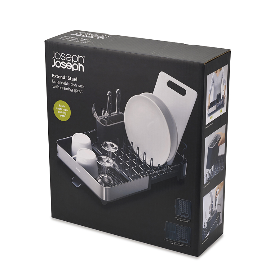 Раздвижная сушилка для посуды Extend Steel гармонично впишется в интерьер любой кухни. Она легко раздвигается под большое количество посуды, при необходимости она может изменять размер почти вдвое. Особенность сушилки Extend Steel – стильная отделка из нержавеющей стали.Металлические стойки с мягкими зубцами бережно удерживают тарелки, защищая их от царапин. Стальная решётка снимается для удобной очистки. Встроенная рейка поддерживает большие предметы, такие как разделочные доски или крышки. Съёмный контейнер для столовых приборов дополнен слотами для ножей. , ,Сушилка снабжена регулируемым сливным каналом, который направляет избыток воды прямо в раковину. Нескользящие ножки делают аксессуар более устойчивым и надежным.