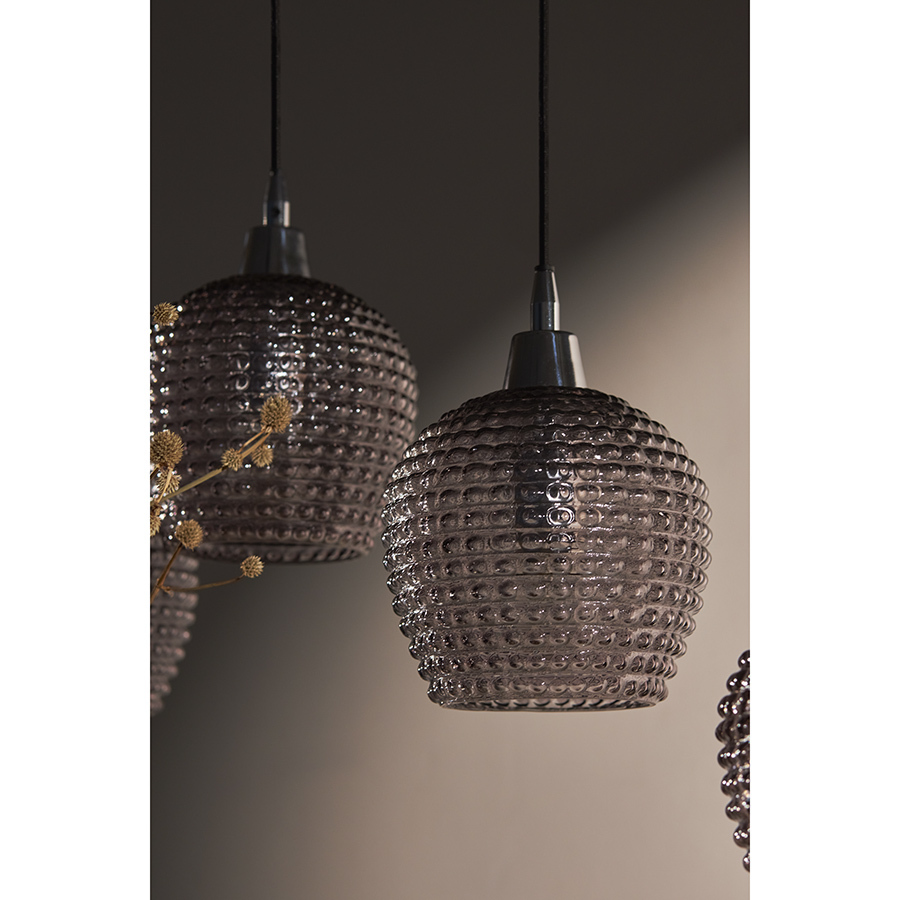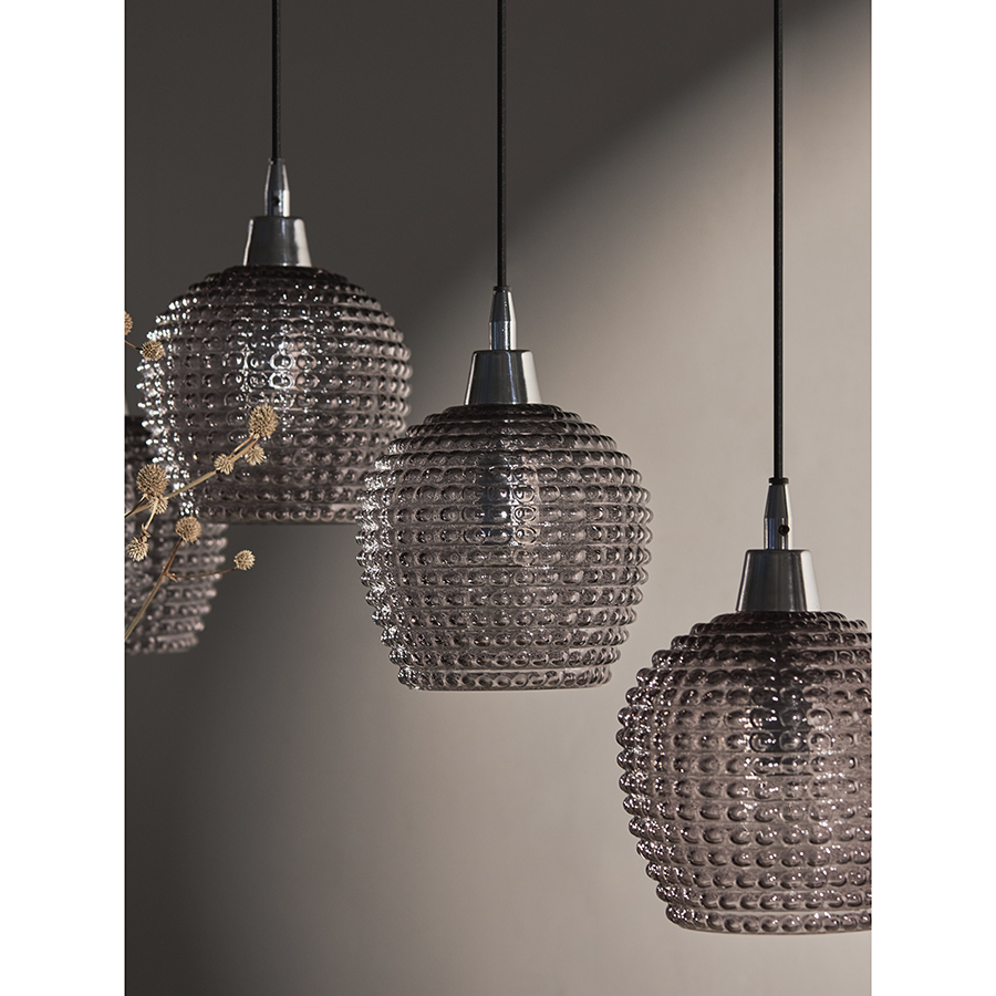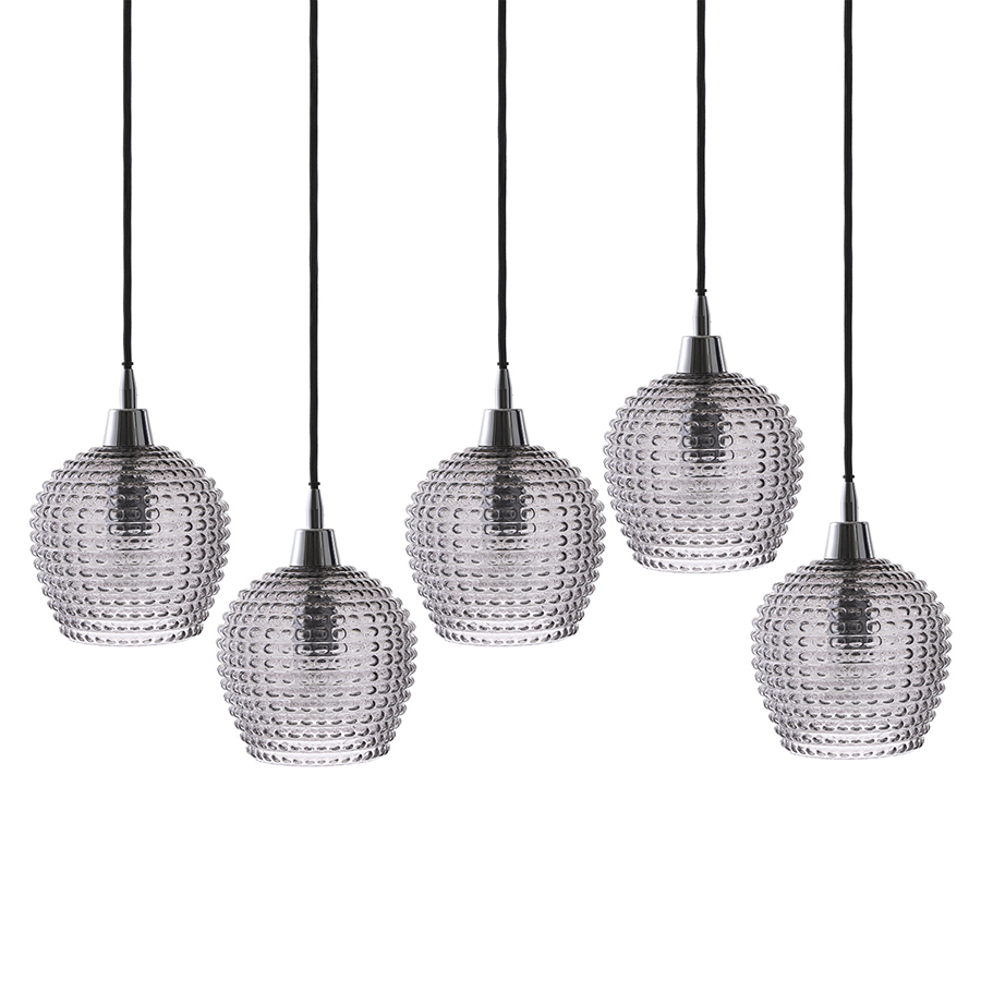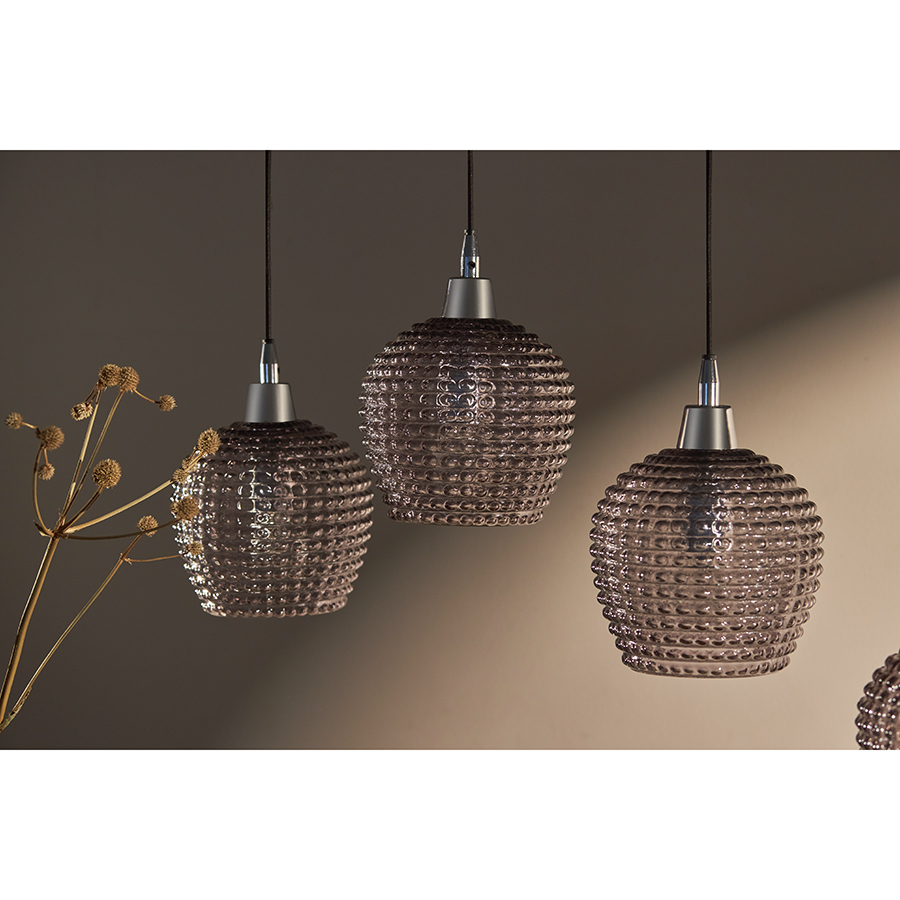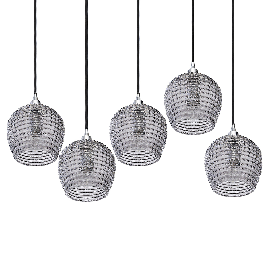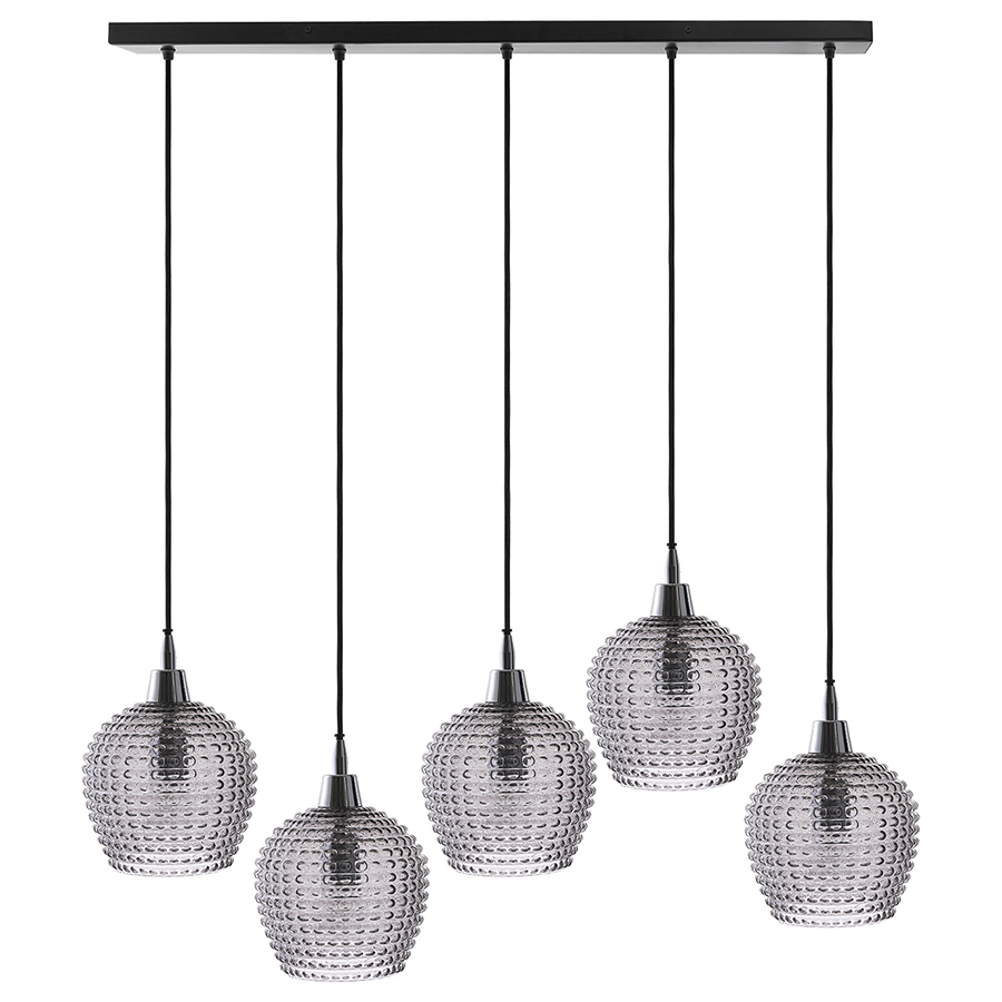 Материалы: стекло, железо. Размеры: 110х18х150 см. Цвет: серый. Длина провода: 1,1 м, 1,3 м, 1,5 м. Тип цоколя: 5хЕ27. Максимальная мощность ламп: 5х25 Вт. Степень пылевлагозащиты: IP20. Площадь освещения: 8,5 кв.м. Лампы в комплекте: нет.