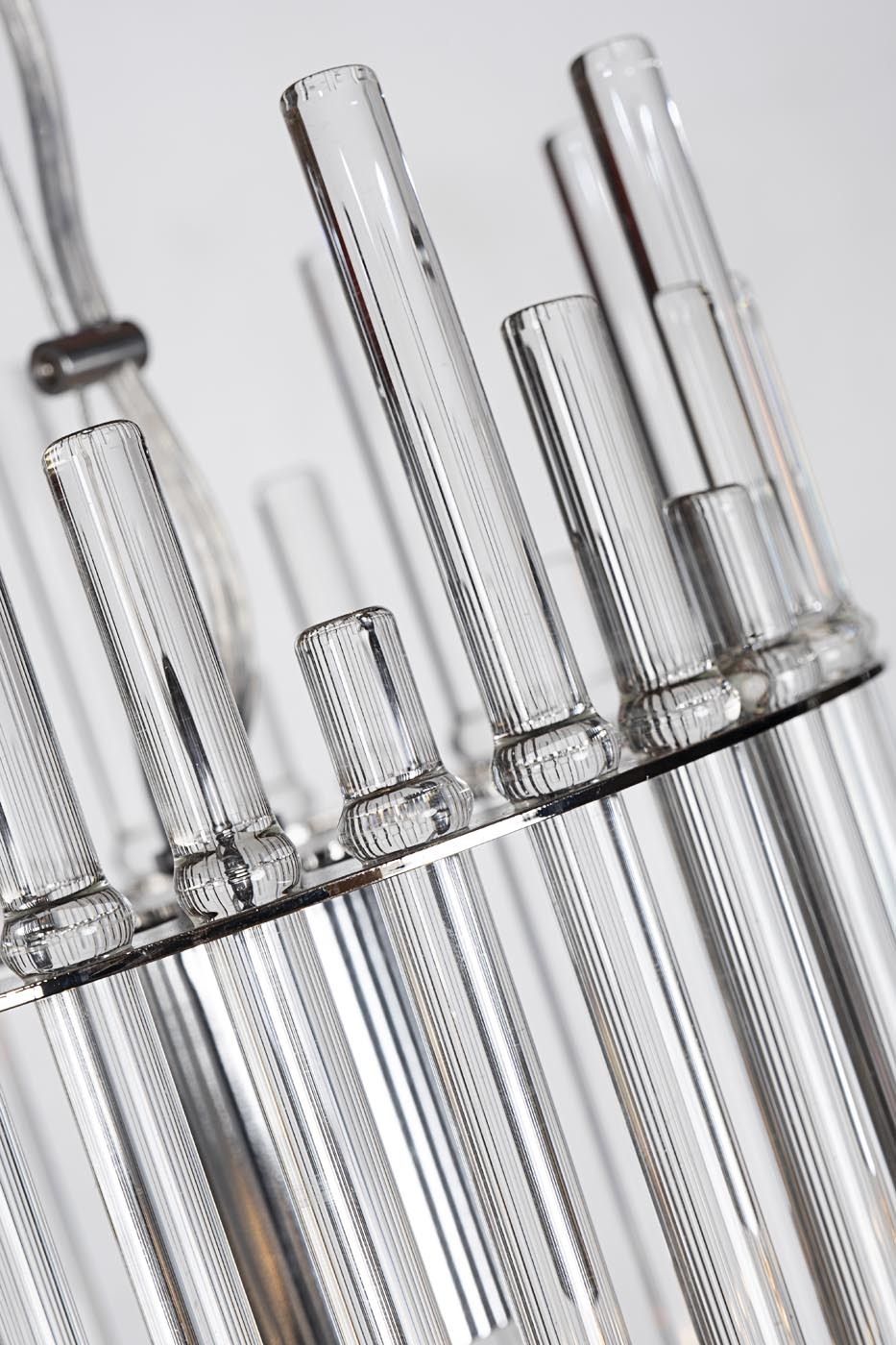 Ни один современный интерьер не может обойтись без искусственного освещения. Для того, чтобы придать ему выразительность, лучше всего использовать дизайнерский подвесной потолочный светильник. Этой модели присуще изысканное очарование, которое свойственно практически всем изделиям в стиле ар - деко. Декоративную функцию в модели выполняют подвесы в форме трубочек. Благодаря такому декору светильник из прозрачного стекла при включенном свете создает фантастическое сияние. Кронштейн аксессуара имеет плавно изогнутую форму, которая отлично гармонирует с подвесами стеклянного потолочного светильника. Рекомендуемая площадь освещения 3 м2.