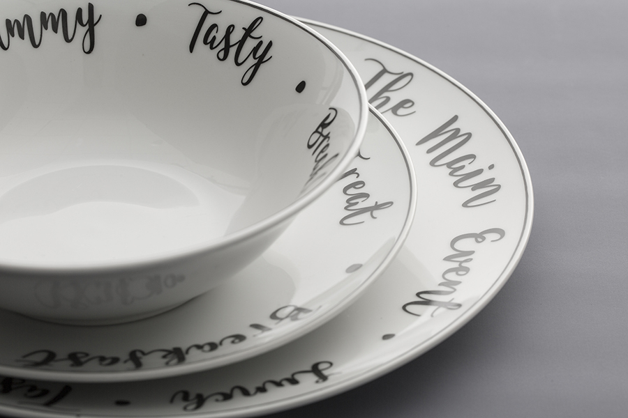 Фарфоровая обеденная тарелка с забавными каллиграфическими надписями – оригинальная деталь на вашем столе.