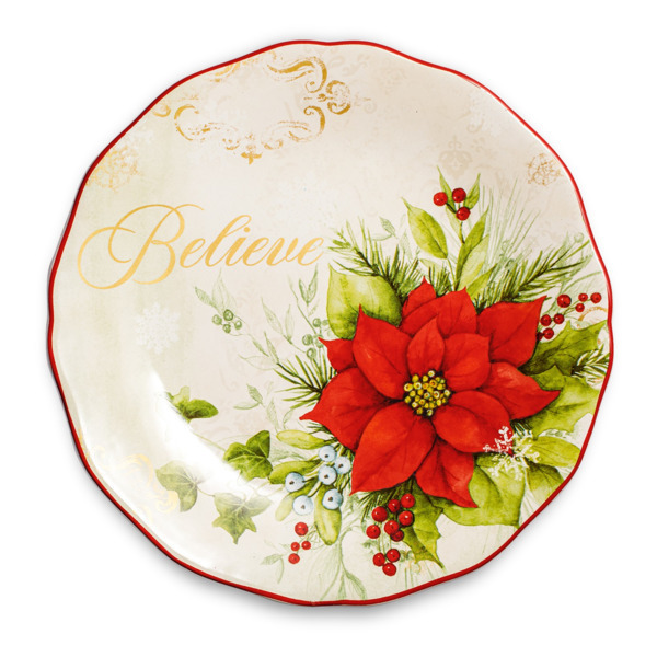 Круглая закусочная тарелка «Вера» от Certified International входит в коллекцию «Красочная зима». Элегантная округлая форма с приподнятым резным краем делает внешний вид гармоничным и изысканным. Поверхность предмета украшает яркий рисунок с изображением декоративного растения пуансеттия, популярного в Америке. Дизайн вдохновлен праздничной атмосферой, он был разработан художницей Сьюзан Уингет.