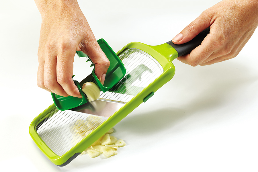 Терка с держателем для продуктов Mandoline идеально подходит для натирания и тонкой нарезки овощей и фруктов. Она поможет быстро превратить огурец, баклажан, чеснок, морковь, редис в слайсы одинакового размера для приготовления салата, супа или украшения праздничных блюд. В терке предусмотрена регулировка толщины срезов. Корпус изделия выполнен из высококачественного пластика. Лезвие из нержавеющей стали стойкое к коррозии и воздействию пищевых кислот. Эргономичная резиновая рукоятка не скользит в руке. Работать с овощерезкой не только просто, но и абсолютно безопасно: ограничитель надежно защитит ваши пальцы.