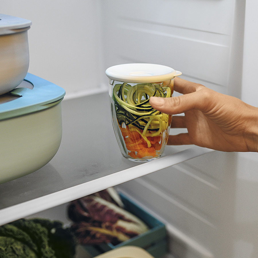 Терка легко разбирается на составные части и пригодна для мытья в посудомоечной машине. В комплект входит крышка, которая плотно прилегает к контейнеру. Благодаря этому красивые спиральки или спагетти из любимых овощей вы сможете хранить в холодильнике или брать с собой.