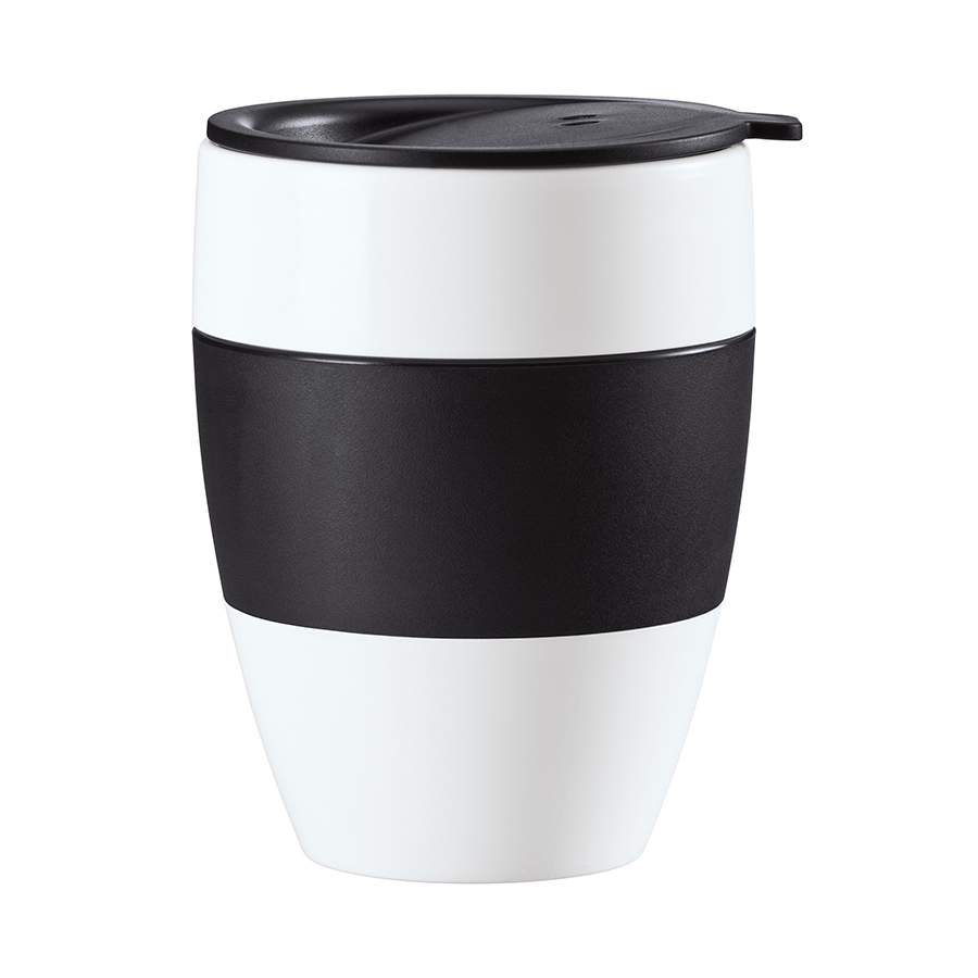 Термокружка AROMA TO GO из термопластика сохранит температуру горячего кофе, но при этом её поверхность не нагреется и не будет обжигать ладони. Плотная крышка не даст расплескать напиток.