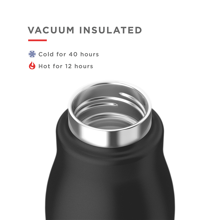 Вакуумная изоляция сохраняет температуру холодных напитков до 40 часов и горячих – до 12. Толстая нержавеющая сталь 18/8 обеспечивает защиту от повреждений. Съемный шнурок обеспечивает удобство при переноске. Порошковое покрытие делает корпус приятным на ощупь.