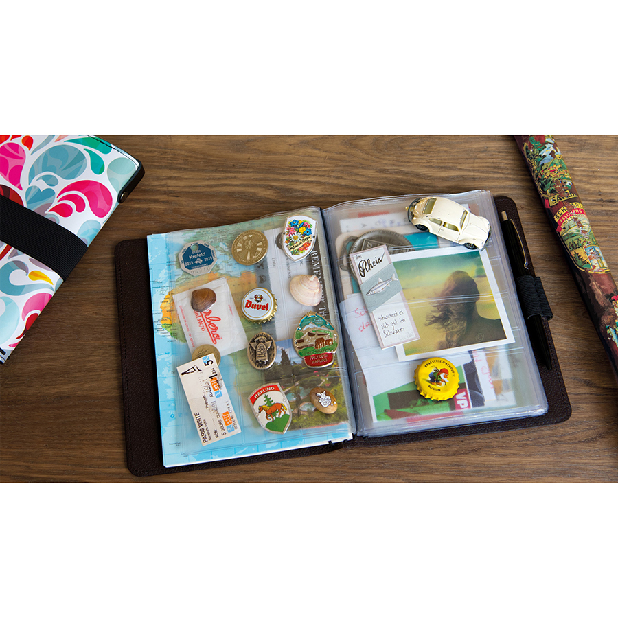 Тетрадь путешественника Florina – удобная книга для хранения различных записей и напоминаний. С помощью этого аксессуара можно собрать в одном месте заметки, зарисовки, монеты, карты городов, фотографии и открытки, использованные билеты, подставки для пивных кружек и сувениры. Органайзер состоит из кожаной обложки, линованного блокнота с 42 страницами и 16 файлов с пластиковыми карманами различных размеров.