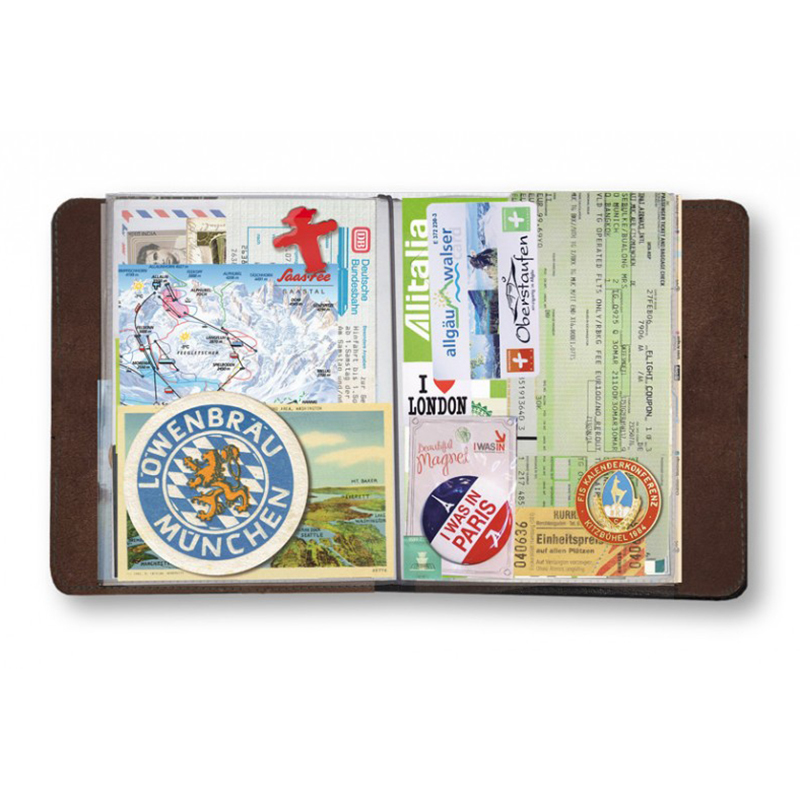 Ваши путешествия и воспоминания, собранные в удобном формате. Обложка из натуральной кожи содержит линованный блокнот с 42 страницами, 16 страниц с пластиковыми карманами различных размеров.