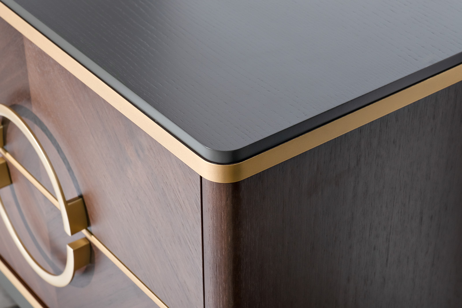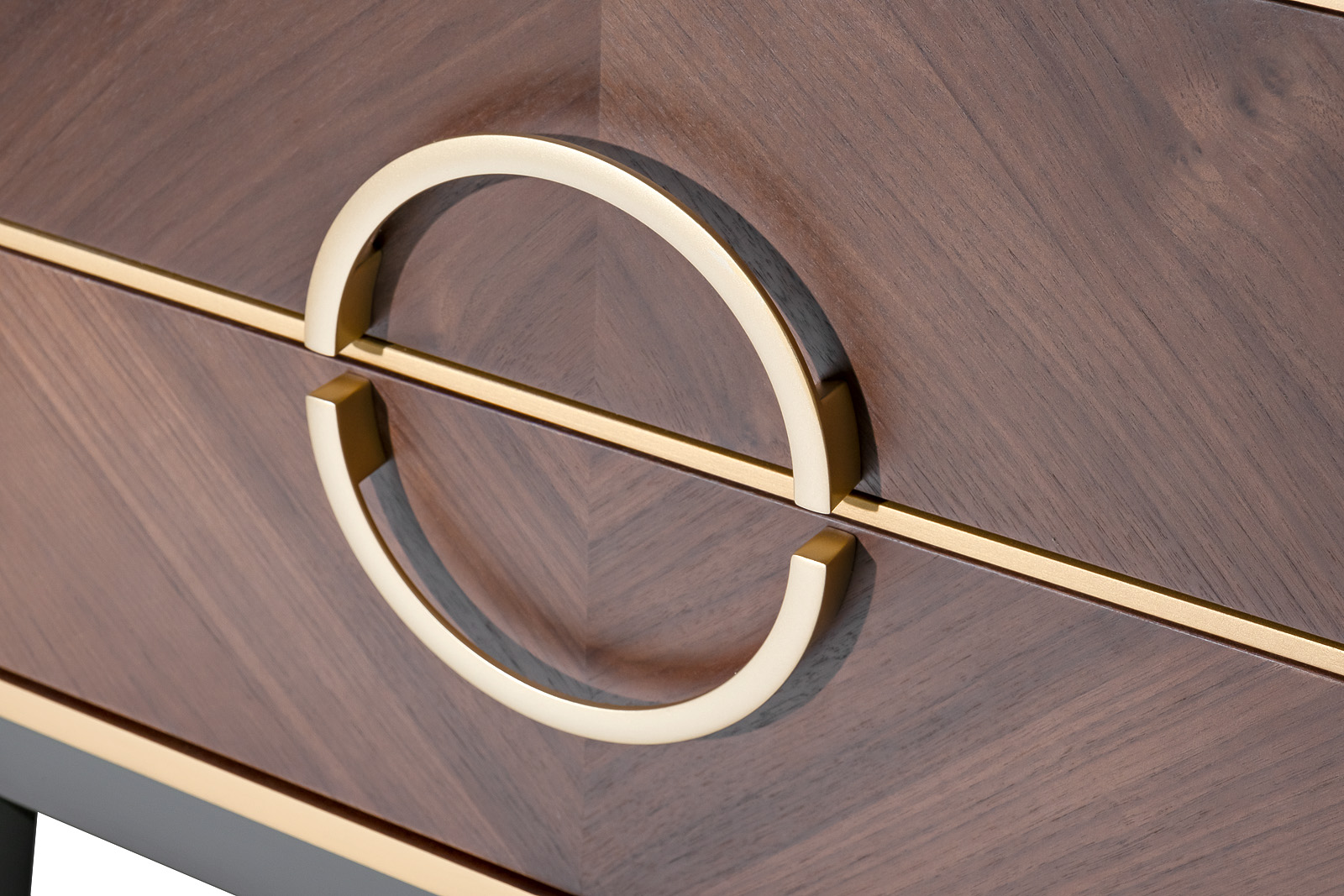 Тумба прикроватная с 2-я ящиками из коллекции "ШПОН". Коллекция "ШПОН" является авторской разработкой студии Garda Decor, в стиле ар-деко. Габариты тумбы: ширина-60см, глубина-60см, высота-40см. Фасады коллекции "ШПОН" облицованы шпоном под цвет "Американский орех", украшены объемными полукруглыми ручками цвета "матовое золото"(ручки-металл) и декоративными элементами из массива бука под цвет "матовое золото". В состав коллекции так же входит: тумба под TV-арт.151SV-10003; консоль-арт.151SV-10002.
